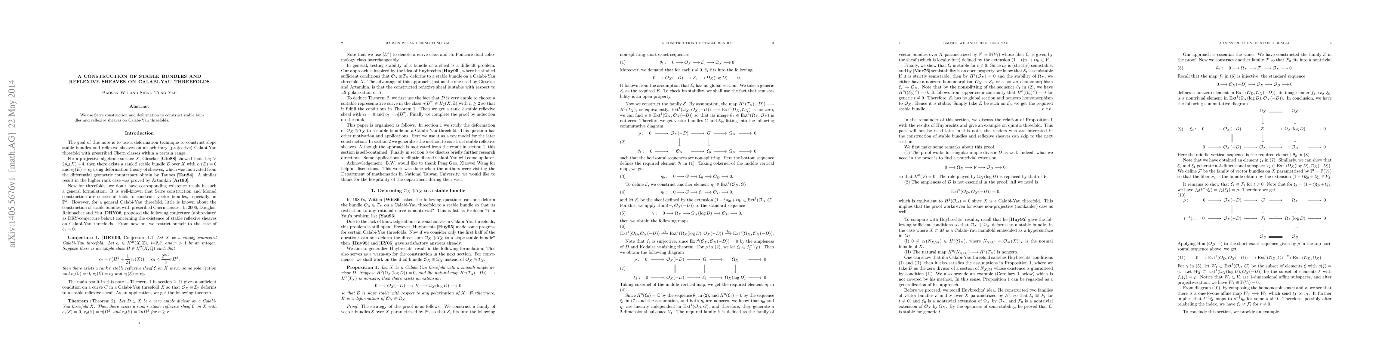 This paper constructs stable bundles and reflexive sheaves on Calabi-Yau threefolds by employing Serre construction techniques and deformation theory. The focus is on utilizing these methods to achieve stability in the resulting bundles and sheaves.