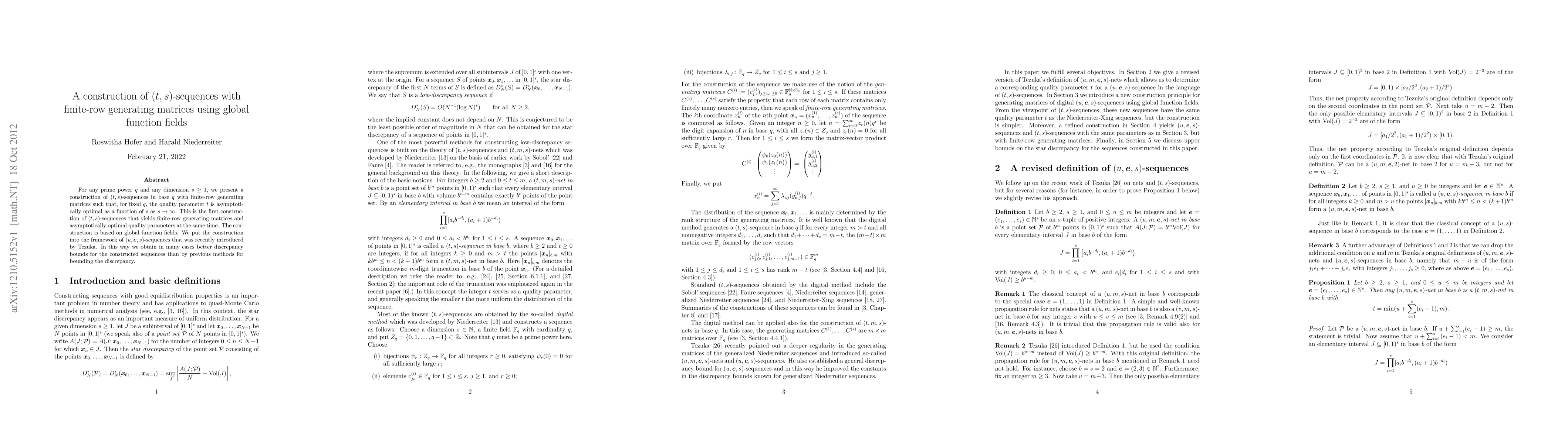 This paper constructs $(t,s)$-sequences in base $q$ using global function fields, achieving finite-row generating matrices and asymptotically optimal quality parameters. This is the first method to combine both features simultaneously, leading to improved discrepancy bounds.