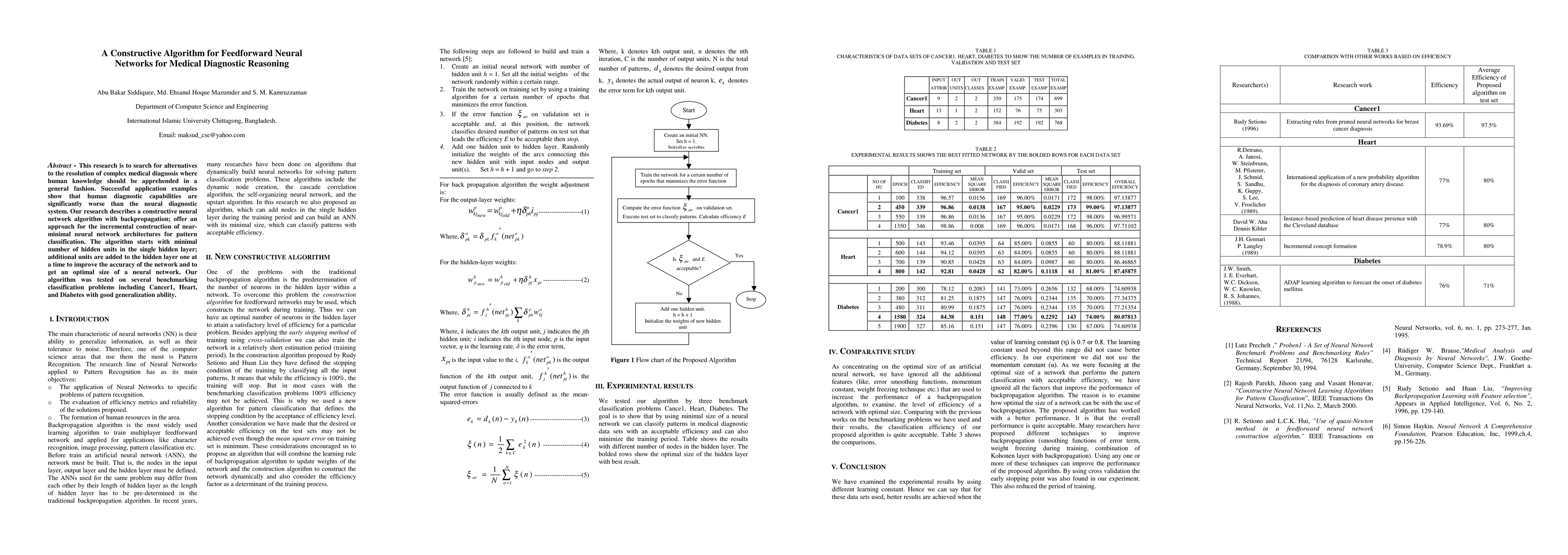 This research is to search for alternatives to the resolution of complex medical diagnosis where human knowledge should be apprehended in a general fashion. Successful application examples show that human diagnostic capabilities are significantly worse than the neural diagnostic system. Our research describes a constructive neural network algorithm with backpropagation; offer an approach for the incremental construction of nearminimal neural network architectures for pattern classification. The algorithm starts with minimal number of hidden units in the single hidden layer; additional units are added to the hidden layer one at a time to improve the accuracy of the network and to get an optimal size of a neural network. Our algorithm was tested on several benchmarking classification problems including Cancer1, Heart, and Diabetes with good generalization ability.