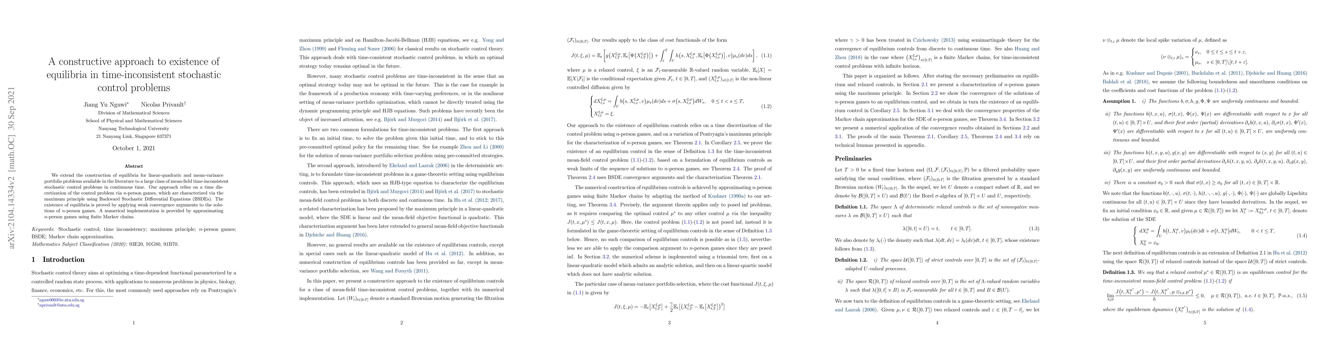 This paper constructs equilibria for a broad class of time-inconsistent stochastic control problems using a time discretization approach via n-person games and Backward Stochastic Differential Equations. The existence of equilibria is demonstrated through weak convergence arguments and numerical implementation via finite Markov chains.