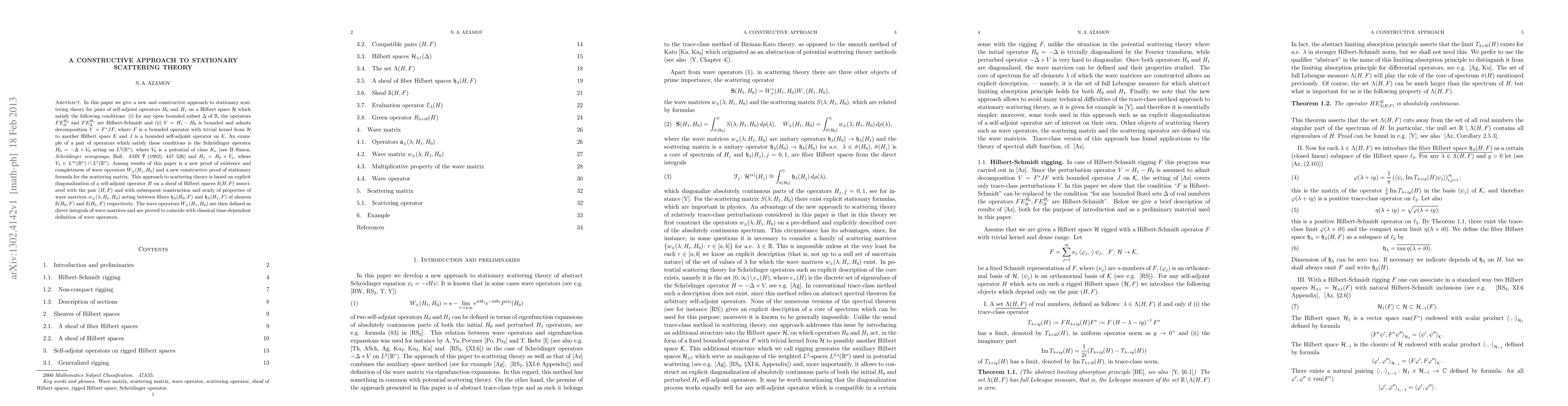 In this paper we give a new and constructive approach to stationary scattering theory for pairs of self-adjoint operators $H_0$ and $H_1$ on a Hilbert space $\mathcal H$ which satisfy the following conditions: (i) for any open bounded subset $\Delta$ of $\mathbb R,$ the operators $F E_\Delta^{H_0}$ and $F E_\Delta^{H_1}$ are Hilbert-Schmidt and (ii) $V = H_1- H_0$ is bounded and admits decomposition $V = F^*JF,$ where $F$ is a bounded operator with trivial kernel from $\mathcal H$ to another Hilbert space $\mathcal K$ and $J$ is a bounded self-adjoint operator on $\mathcal K.$ An example of a pair of operators which satisfy these conditions is the Schr\"odinger operator $H_0 = -\Delta + V_0$ acting on $L^2(\mathbb R^\nu),$ where $V_0$ is a potential of class $K_\nu$ (see B.\,Simon, {\it Schr\"odinger semigroups,} Bull. AMS 7, 1982, 447--526) and $H_1 = H_0 + V_1,$ where $V_1 \in L^\infty(\mathbb R^\nu) \cap L^1(\mathbb R^\nu).$ Among results of this paper is a new proof of existence and completeness of wave operators $W_\pm(H_1,H_0)$ and a new constructive proof of stationary formula for the scattering matrix. This approach to scattering theory is based on explicit diagonalization of a self-adjoint operator $H$ on a sheaf of Hilbert spaces $\EuScript S(H,F)$ associated with the pair $(H,F)$ and with subsequent construction and study of properties of wave matrices $w_\pm(\lambda; H_1,H_0)$ acting between fibers $\mathfrak h_\lambda(H_0,F)$ and $\mathfrak h_\lambda(H_1,F)$ of sheaves $\EuScript S(H_0,F)$ and $\EuScript S(H_1,F)$ respectively. The wave operators $W_\pm(H_1,H_0)$ are then defined as direct integrals of wave matrices and are proved to coincide with classical time-dependent definition of wave operators.