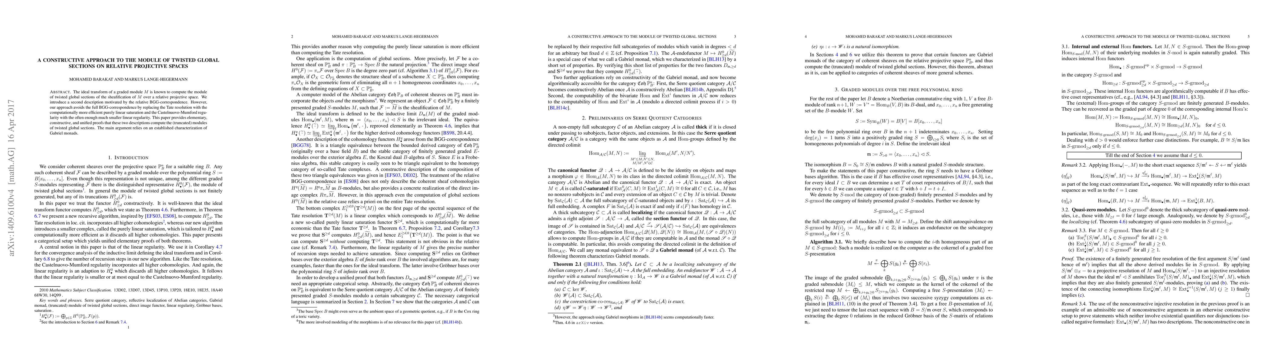 The ideal transform of a graded module $M$ is known to compute the module of twisted global sections of the sheafification of $M$ over a relative projective space. We introduce a second description motivated by the relative BGG-correspondence. However, our approach avoids the full BGG-correspondence by replacing the Tate resolution with the computationally more efficient purely linear saturation and the Castelnuovo-Mumford regularity with the often enough much smaller linear regularity. This paper provides elementary, constructive, and unified proofs that these two descriptions compute the (truncated) modules of twisted global sections. The main argument relies on an established characterization of Gabriel monads.