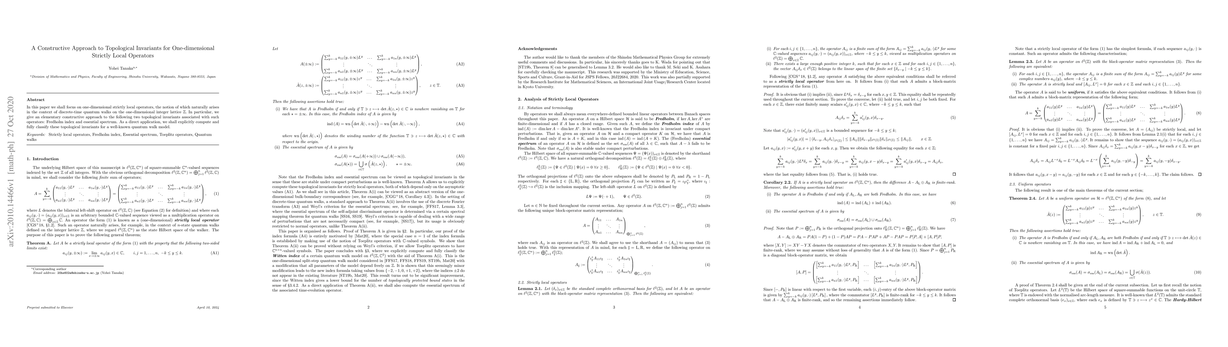 In this paper we shall focus on one-dimensional strictly local operators, the notion of which naturally arises in the context of discrete-time quantum walks on the one-dimensional integer lattice. In particular, we give an elementary constructive approach to the following two topological invariants associated with such operators: Fredholm index and essential spectrum. As a direct application, we shall explicitly compute and fully classify these topological invariants for a well-known quantum walk model.
