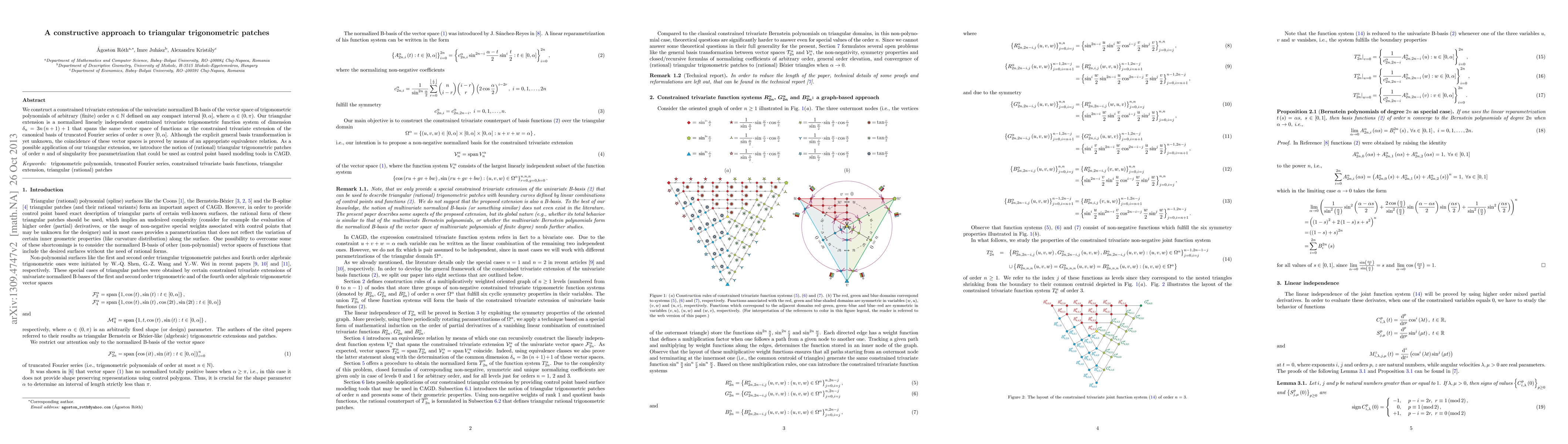 We construct a constrained trivariate extension of the univariate normalized B-basis of the vector space of trigonometric polynomials of arbitrary (finite) order n defined on any compact interval [0,\alpha], where \alpha is a fixed (shape) parameter in (0,\pi). Our triangular extension is a normalized linearly independent constrained trivariate trigonometric function system of dimension 3n(n+1)+1 that spans the same vector space of functions as the constrained trivariate extension of the canonical basis of truncated Fourier series of order n over [0,\alpha]. Although the explicit general basis transformation is yet unknown, the coincidence of these vector spaces is proved by means of an appropriate equivalence relation. As a possible application of our triangular extension, we introduce the notion of (rational) triangular trigonometric patches of order n and of singularity free parametrization that could be used as control point based modeling tools in CAGD.