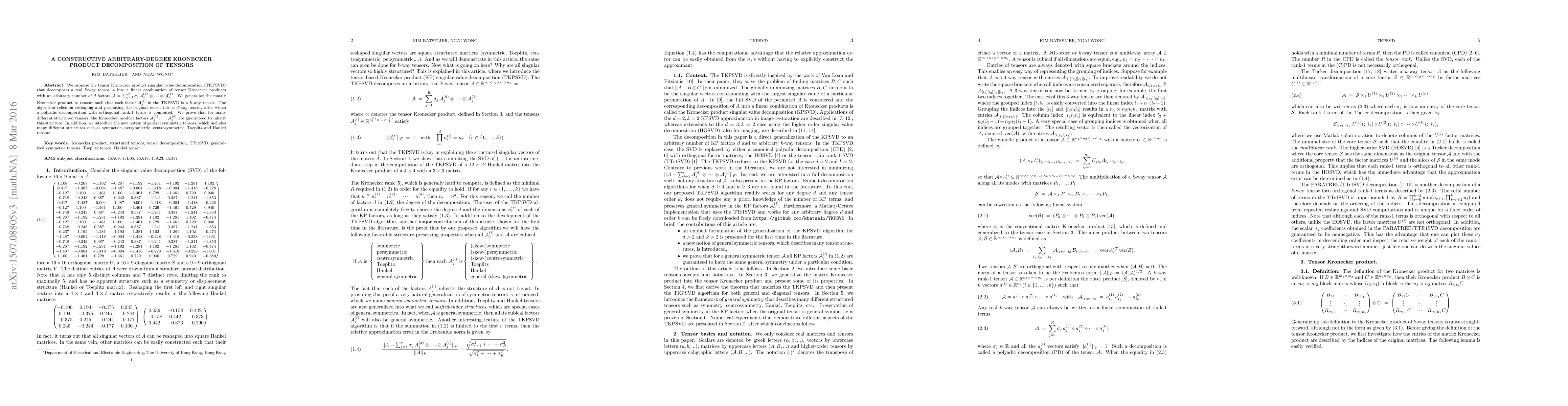 This paper proposes a tensor Kronecker product singular value decomposition (TKPSVD) to decompose $k$-way tensors into a linear combination of tensor Kronecker products with an arbitrary number of factors. The algorithm reshapes and permutes the tensor to compute a polyadic decomposition, and it guarantees that the Kronecker product factors inherit the structure of the original tensor.