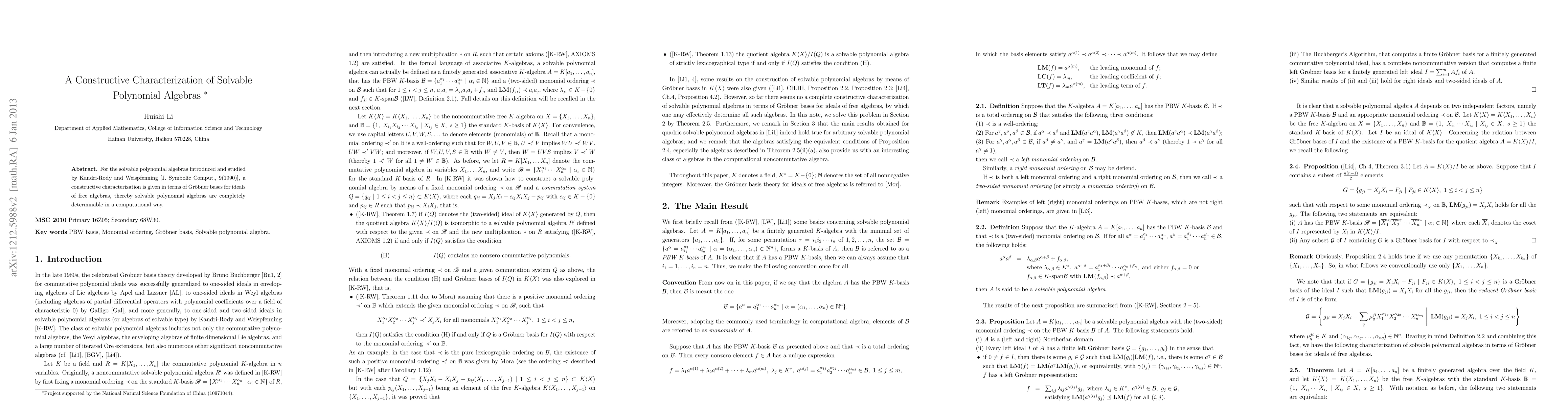 For the solvable polynomial algebras introduced and studied by Kandri-Rody and Weispfenning [J. Symbolic Comput., 9(1990)], a constructive characterization is given in terms of Gr\"obner bases for ideals of free algebras, thereby solvable polynomial algebras are completely determinable in a computational way.