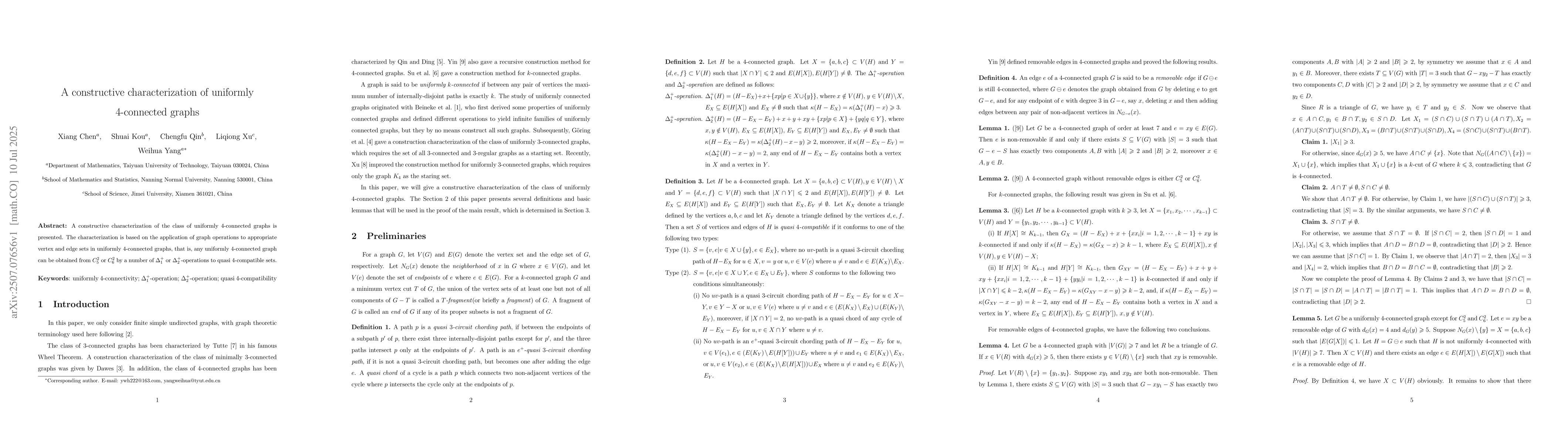 A constructive characterization of the class of uniformly $4$-connected graphs is presented. The characterization is based on the application of graph operations to appropriate vertex and edge sets in uniformly $4$-connected graphs, that is, any uniformly $4$-connected graph can be obtained from $C_5^2$ or $C_6^2$ by a number of $\Delta_1^+$ or $\Delta_2^+$-operations to quasi $4$-compatible sets.