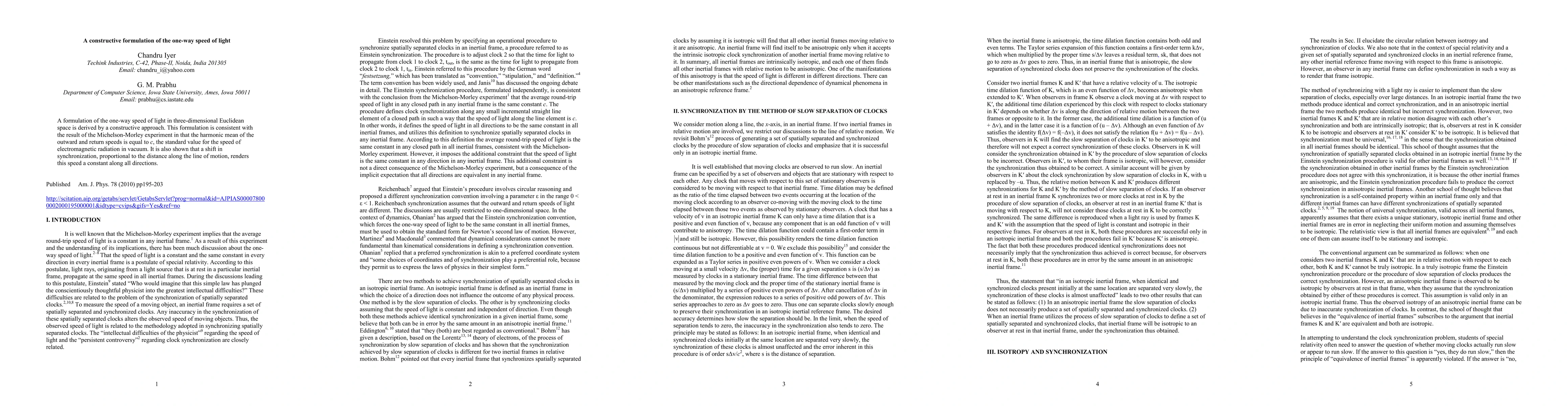 A formulation of the one-way speed of light in three-dimensional Euclidean space is derived by a constructive approach. This formulation is consistent with the result of the Michelson-Morley experiment in that the harmonic mean of the outward and return speeds is equal to c, the standard value for the speed of electromagnetic radiation in vacuum. It is also shown that a shift in synchronization, proportional to the distance along the line of motion, renders this speed a constant along all directions.