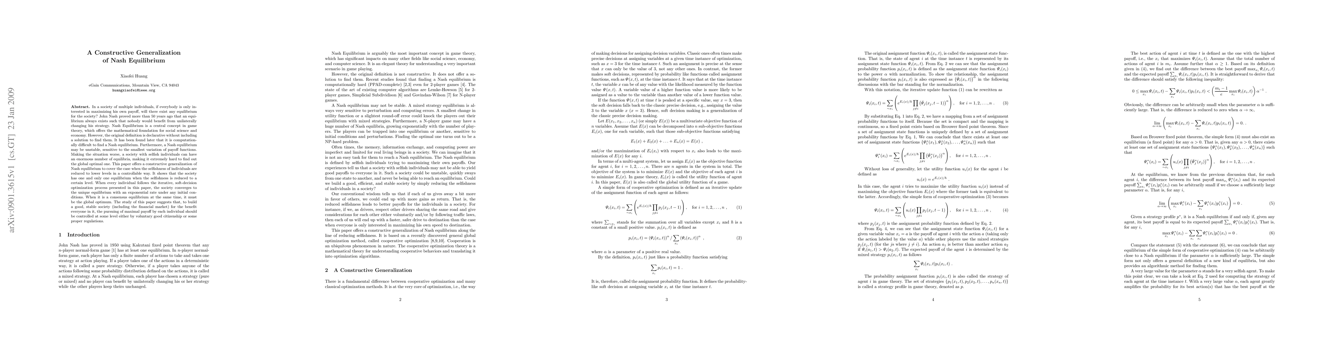 In a society of multiple individuals, if everybody is only interested in maximizing his own payoff, will there exist any equilibrium for the society? John Nash proved more than 50 years ago that an equilibrium always exists such that nobody would benefit from unilaterally changing his strategy. Nash Equilibrium is a central concept in game theory, which offers the mathematical foundation for social science and economy. However, the original definition is declarative without including a solution to find them. It has been found later that it is computationally difficult to find a Nash equilibrium. Furthermore, a Nash equilibrium may be unstable, sensitive to the smallest variation of payoff functions. Making the situation worse, a society with selfish individuals can have an enormous number of equilibria, making it extremely hard to find out the global optimal one. This paper offers a constructive generalization of Nash equilibrium to cover the case when the selfishness of individuals are reduced to lower levels in a controllable way. It shows that the society has one and only one equilibrium when the selfishness is reduced to a certain level. When every individual follows the iterative, soft-decision optimization process presented in this paper, the society converges to the unique equilibrium with an exponential rate under any initial conditions. When it is a consensus equilibrium at the same time, it must be the global optimum. The study of this paper suggests that, to build a good, stable society (including the financial market) for the benefit everyone in it, the pursuing of maximal payoff by each individual should be controlled at some level either by voluntary good citizenship or some proper regulations.