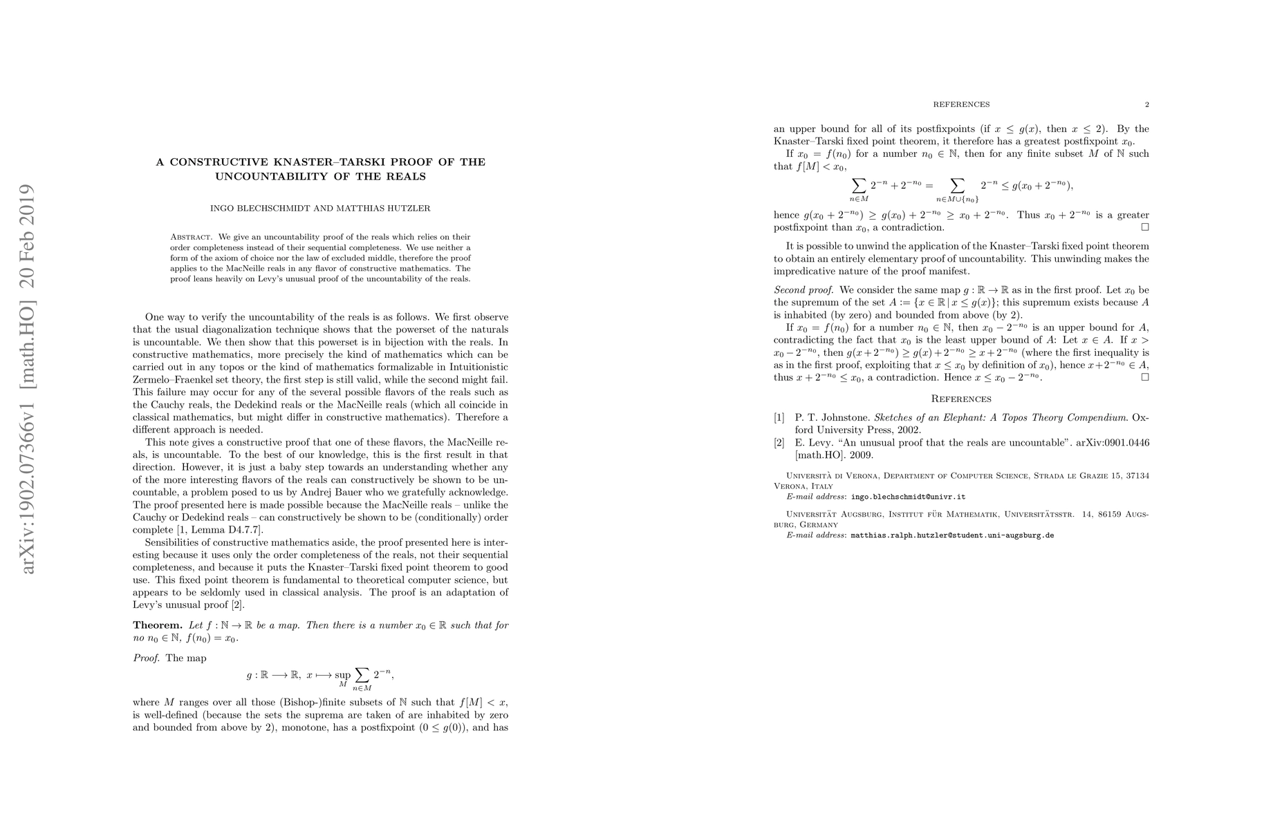 We give an uncountability proof of the reals which relies on their order completeness instead of their sequential completeness. We use neither a form of the axiom of choice nor the law of excluded middle, therefore the proof applies to the MacNeille reals in any flavor of constructive mathematics. The proof leans heavily on Levy's unusual proof of the uncountability of the reals.