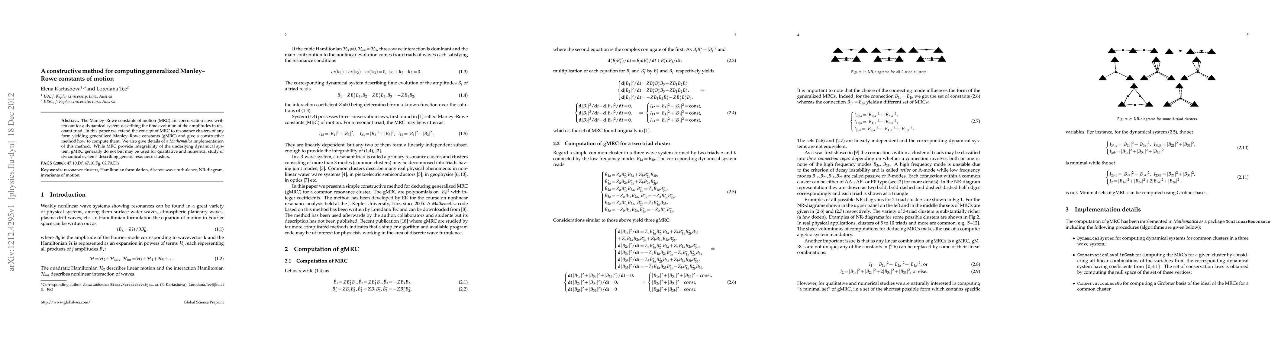 The Manley--Rowe constants of motion (MRC) are conservation laws written out for a dynamical system describing the time evolution of the amplitudes in resonant triad. In this paper we extend the concept of MRC to resonance clusters of any form yielding generalized Manley--Rowe constants (gMRC) and give a constructive method how to compute them. We also give details of a \emph{Mathematica} implementation of this method. While MRC provide integrability of the underlying dynamical system, gMRC generally do not but may be used for qualitative and numerical study of dynamical systems describing generic resonance clusters.