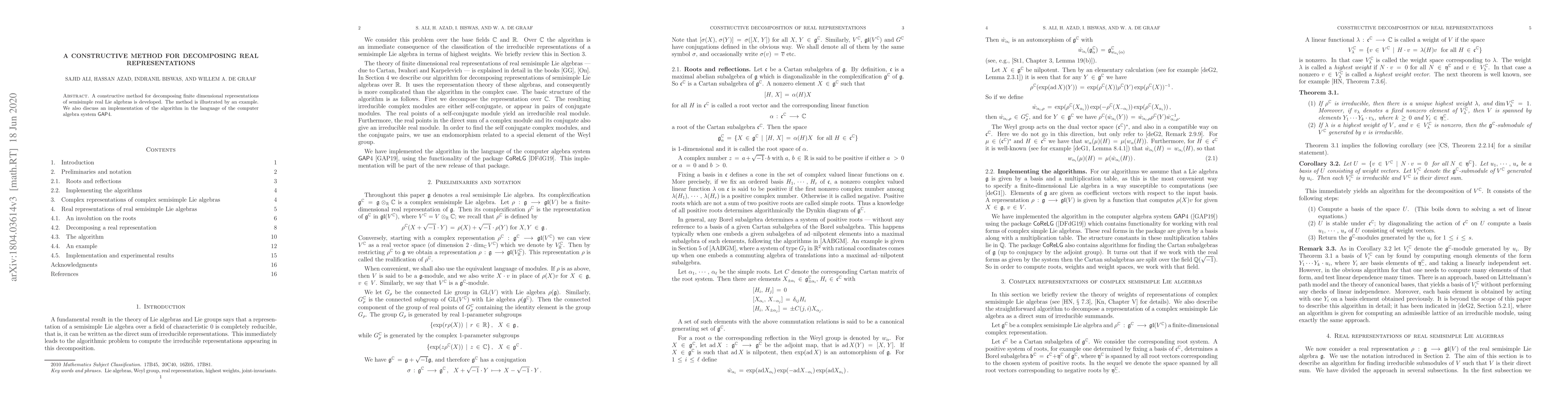 The paper presents a constructive method for decomposing finite-dimensional representations of semisimple real Lie algebras. It introduces an involution on the set of roots and defines related objects in the Weyl group, automorphisms of \(\mathbb{C}\), and elements of \(\text{GC}\). The algorithm is illustrated with an example and implemented in the computer algebra system GAP4.