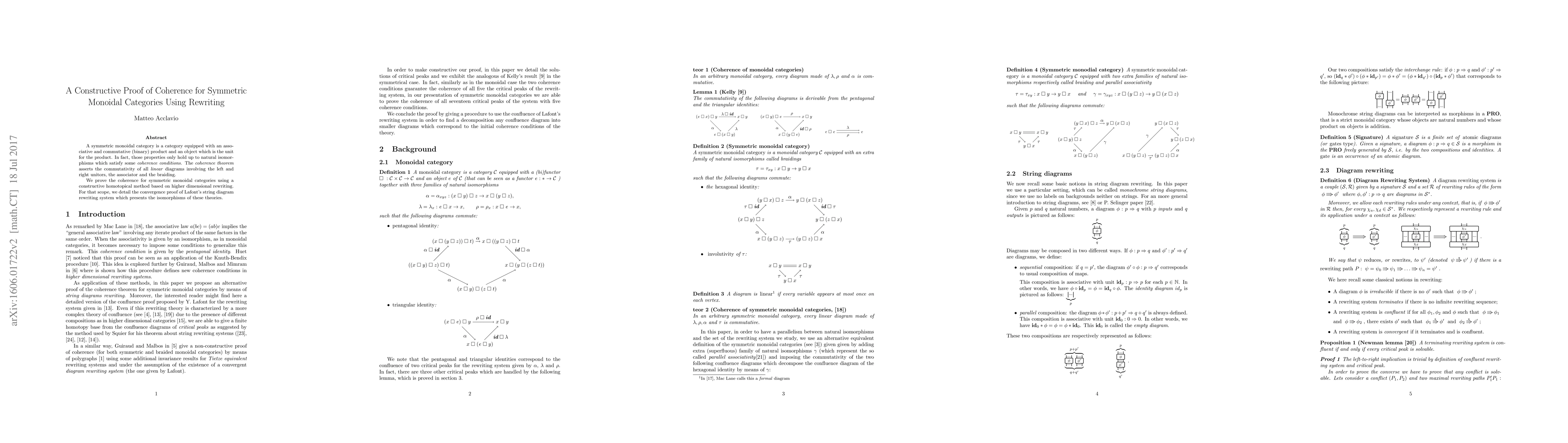 This paper presents a constructive proof of coherence for symmetric monoidal categories using homotopical methods based on rewriting. It focuses on Lafont's string diagram rewriting system to demonstrate the commutativity of linear diagrams involving unitors, associator, and braiding.