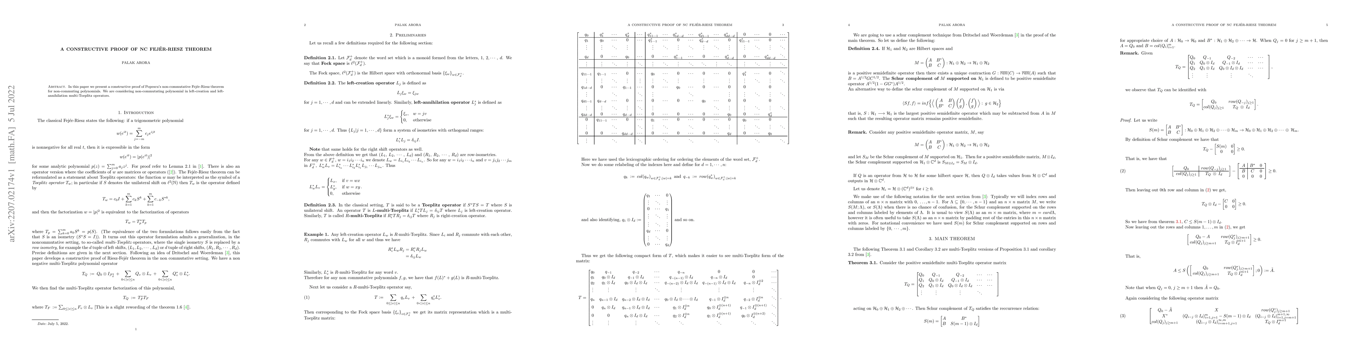 This paper provides a constructive proof of Popescu's non-commutative Fejér-Riesz theorem for non-commuting polynomials, focusing on left-creation and left-annihilation multi-Toeplitz operators. The proof elucidates the properties of these operators in the non-commutative setting.