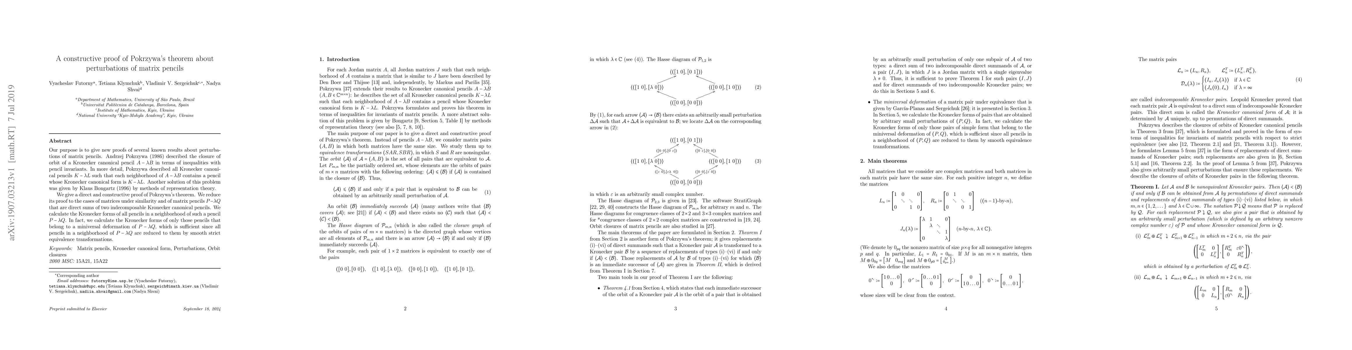 Our purpose is to give new proofs of several known results about perturbations of matrix pencils. Andrzej Pokrzywa (1986) described the closure of orbit of a Kronecker canonical pencil $A-\lambda B$ in terms of inequalities with pencil invariants. In more detail, Pokrzywa described all Kronecker canonical pencils $K-\lambda L$ such that each neighborhood of $A-\lambda B$ contains a pencil whose Kronecker canonical form is $K-\lambda L$. Another solution of this problem was given by Klaus Bongartz (1996) by methods of representation theory. We give a direct and constructive proof of Pokrzywa's theorem. We reduce its proof to the cases of matrices under similarity and of matrix pencils $P-\lambda Q$ that are direct sums of two indecomposable Kronecker canonical pencils. We calculate the Kronecker forms of all pencils in a neighborhood of such a pencil $P-\lambda Q$. In fact, we calculate the Kronecker forms of only those pencils that belong to a miniversal deformation of $P-\lambda Q$, which is sufficient since all pencils in a neighborhood of $P-\lambda Q$ are reduced to them by smooth strict equivalence transformations.