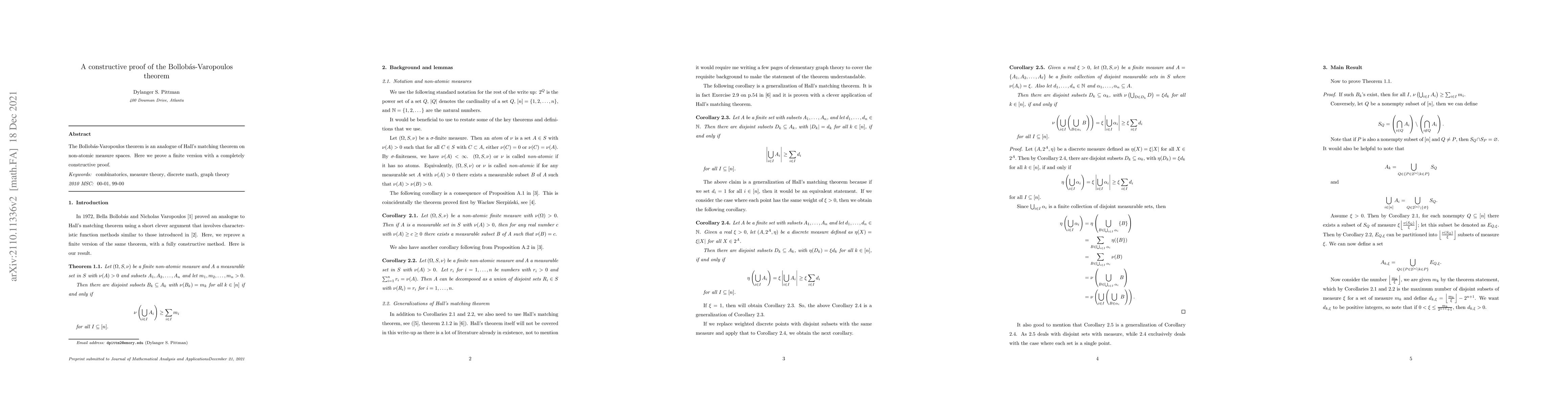Summary: This paper presents a fully constructive proof of a finite version of the Bollobás-Varopoulos theorem, which is an analogue of Hall's matching theorem adapted for non-atomic measure spaces. The proof provides a clear, step-by-step construction method.
