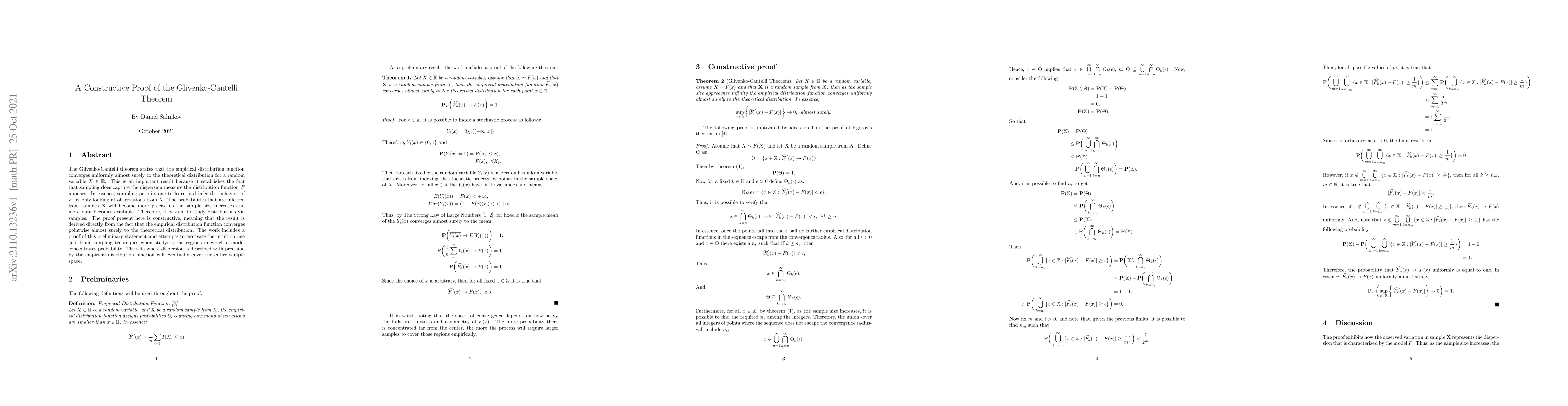 The Glivenko-Cantelli theorem states that the empirical distribution function converges uniformly almost surely to the theoretical distribution for a random variable $X \in \mathbb{R}$. This is an important result because it establishes the fact that sampling does capture the dispersion measure the distribution function $F$ imposes. In essence, sampling permits one to learn and infer the behavior of $F$ by only looking at observations from $X$. The probabilities that are inferred from samples $\mathbf{X}$ will become more precise as the sample size increases and more data becomes available. Therefore, it is valid to study distributions via samples. The proof present here is constructive, meaning that the result is derived directly from the fact that the empirical distribution function converges pointwise almost surely to the theoretical distribution. The work includes a proof of this preliminary statement and attempts to motivate the intuition one gets from sampling techniques when studying the regions in which a model concentrates probability. The sets where dispersion is described with precision by the empirical distribution function will eventually cover the entire sample space.