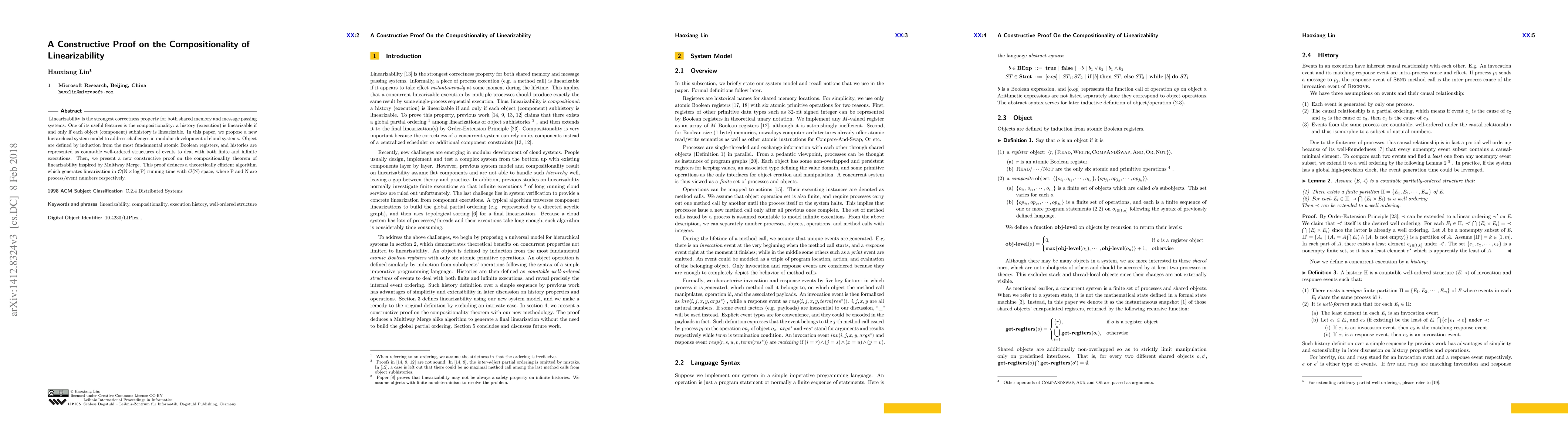 This paper introduces a new hierarchical system model to facilitate modular cloud system development, proving the compositionality of linearizability via a constructive proof inspired by Multiway Merge. The proof provides an efficient algorithm for generating linearizations in O(N*logP) time with O(N) space.