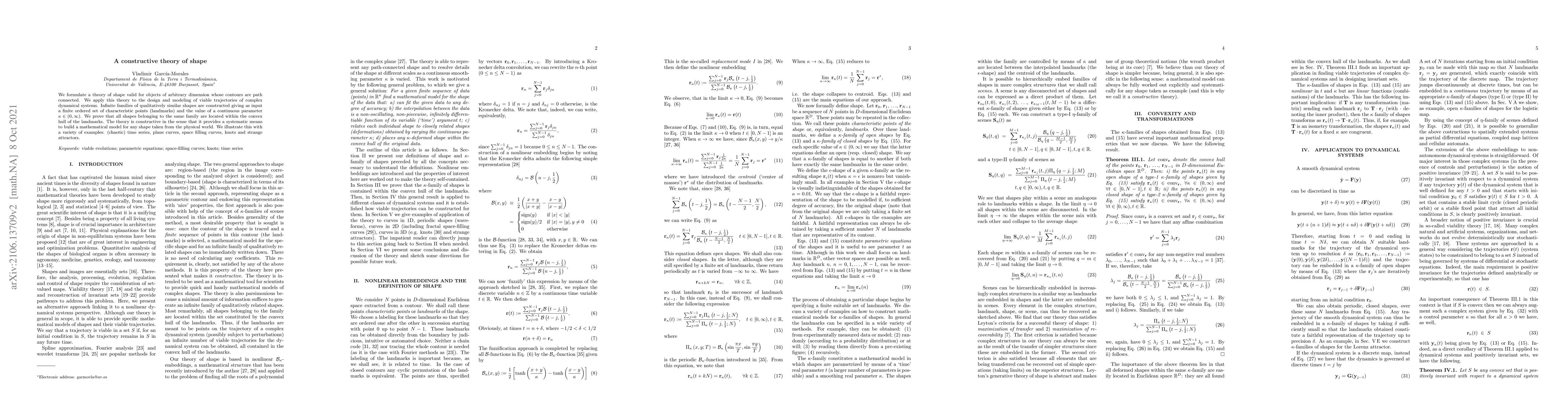 We formulate a theory of shape valid for objects of arbitrary dimension whose contours are path connected. We apply this theory to the design and modeling of viable trajectories of complex dynamical systems. Infinite families of qualitatively similar shapes are constructed giving as input a finite ordered set of characteristic points (landmarks) and the value of a continuous parameter $\kappa \in (0,\infty)$. We prove that all shapes belonging to the same family are located within the convex hull of the landmarks. The theory is constructive in the sense that it provides a systematic means to build a mathematical model for any shape taken from the physical world. We illustrate this with a variety of examples: (chaotic) time series, plane curves, space filling curves, knots and strange attractors.