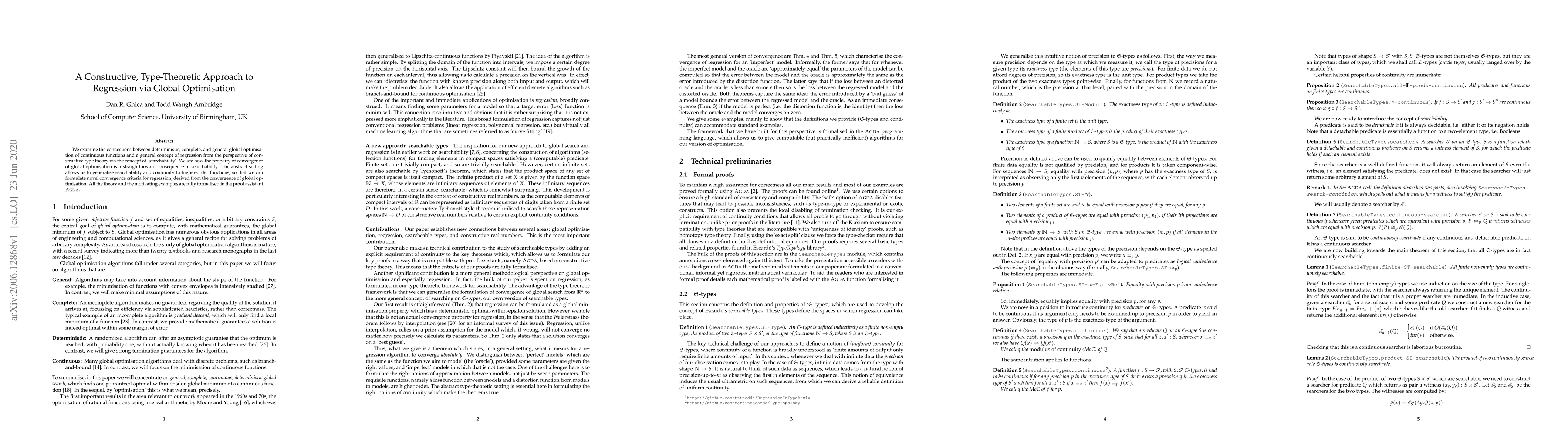 This paper explores the link between global optimisation and regression through constructive type theory, formalising the concept of 'searchability'. It establishes convergence criteria for regression derived from global optimisation and presents the entire theoretical framework in Agda.