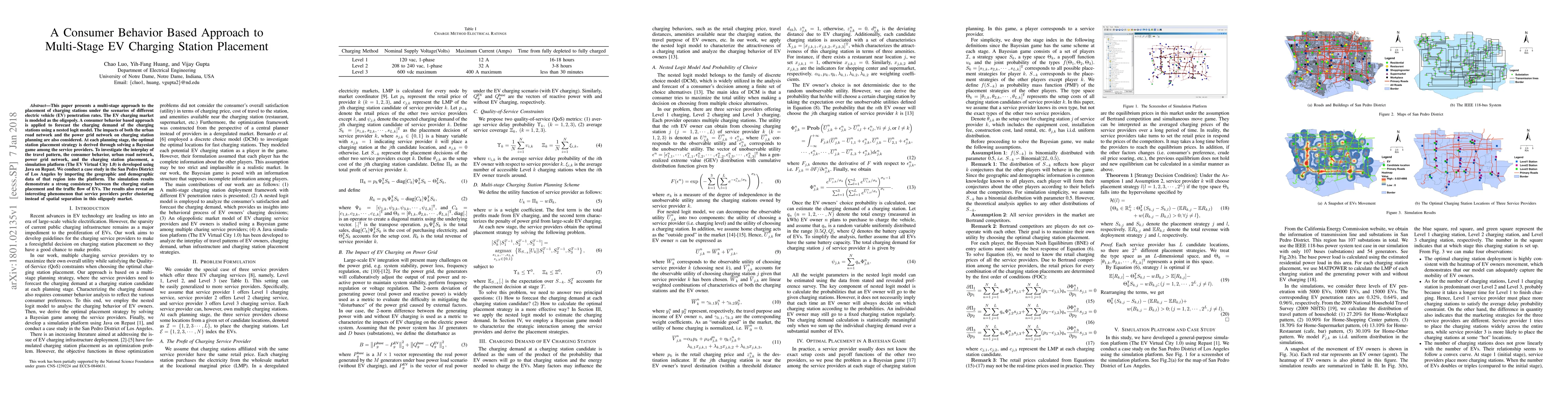This paper proposes a multi-stage method for optimal EV charging station placement based on consumer behavior and nested logit models, considering urban and power grid networks. Simulation results from the San Pedro District show that service providers favor clustering over separation in an oligopoly market.