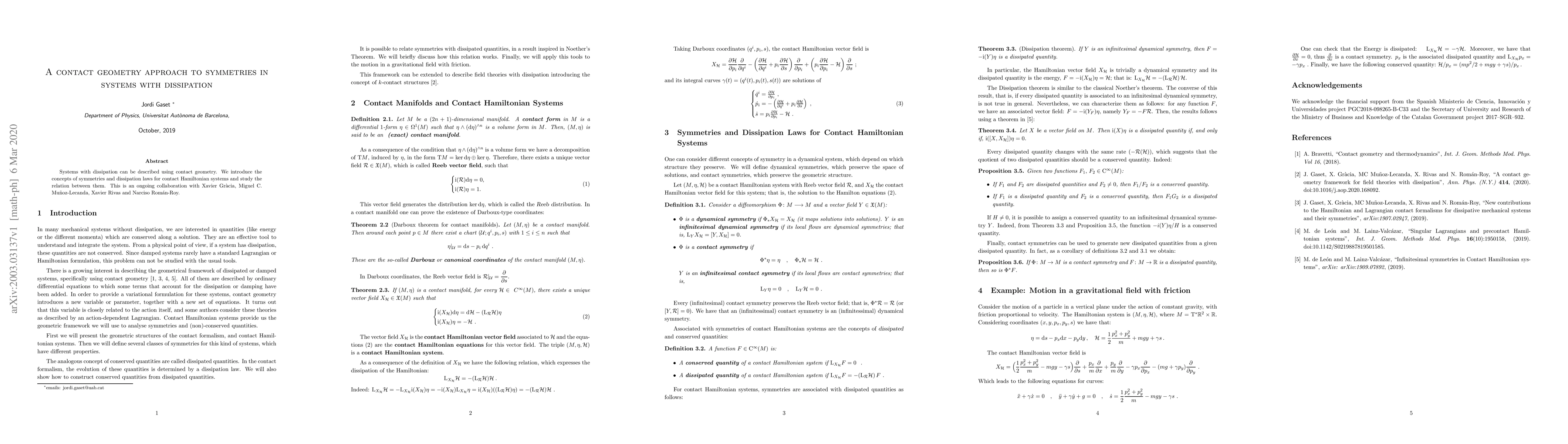 This paper utilizes contact geometry to describe symmetries in dissipative systems, introducing concepts of symmetries and dissipation laws for contact Hamiltonian systems and investigating their relationship. The research is a collaborative effort involving Xavier Grácia, Miguel C. Muñoz-Lecanda, Xavier Rivas, and Narciso Román-Roy.
