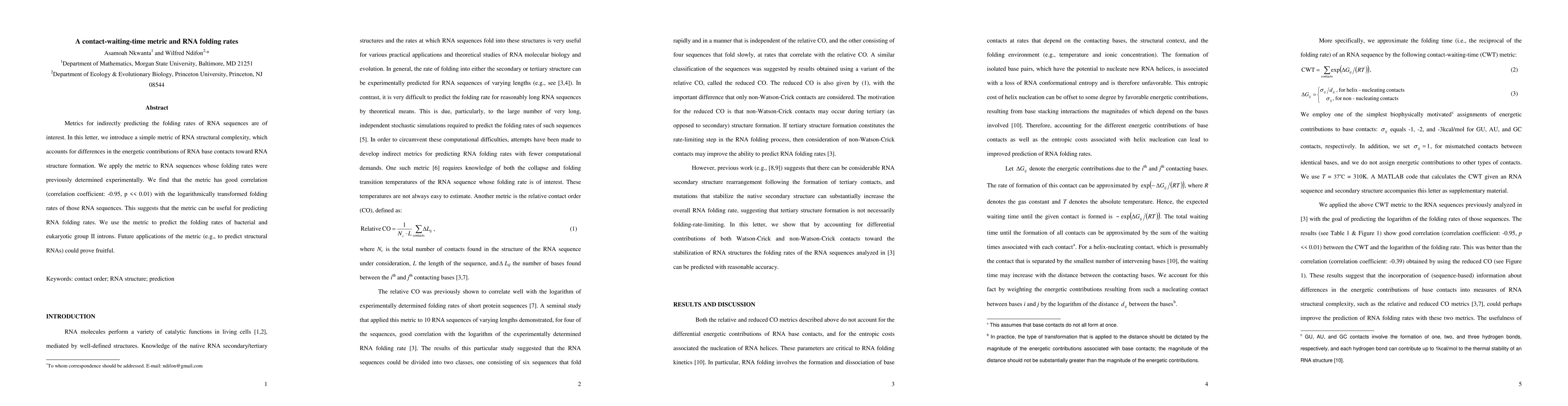This paper introduces a new metric to predict RNA folding rates based on the energetic contributions of RNA base contacts, showing a strong correlation (-0.95) with experimentally determined folding rates. The metric's potential is demonstrated through its application to bacterial and eukaryotic group II introns.