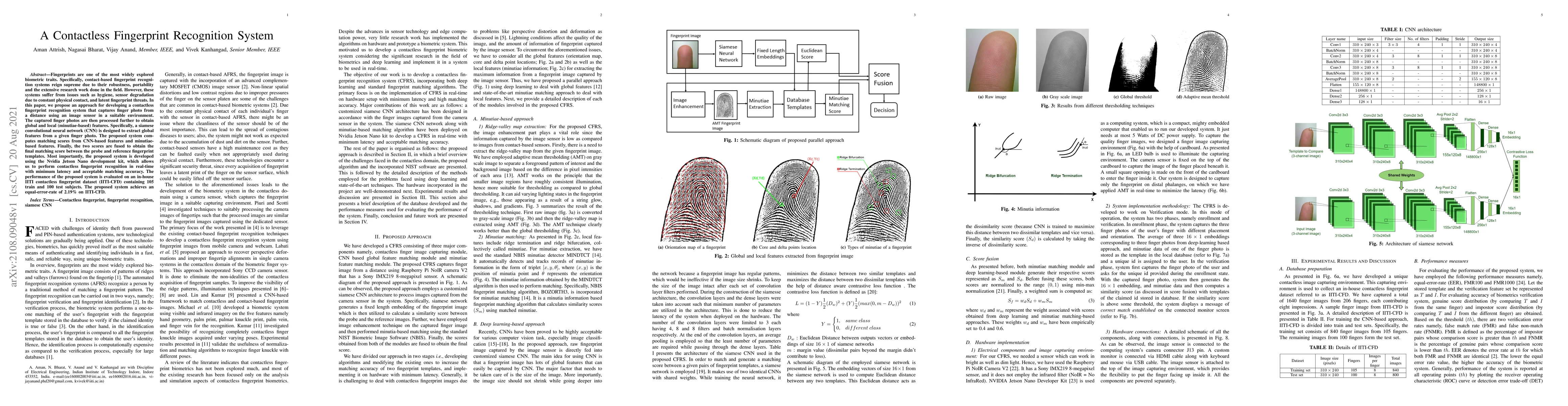 This paper presents a contactless fingerprint recognition system using an image sensor to capture finger photos from a distance, employing a Siamese CNN for global feature extraction and minutiae-based features for local details. The system achieves real-time performance on the Jetson Nano, demonstrating an equal-error-rate of 2.19% on an in-house dataset.
