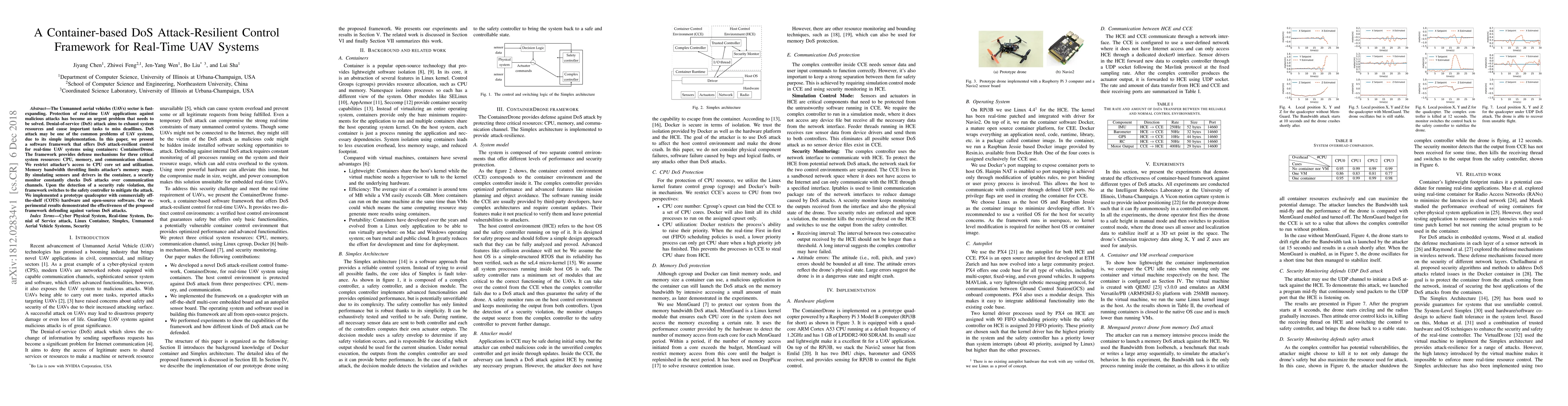 This paper introduces ContainerDrone, a container-based framework designed to protect real-time UAV systems from DoS attacks by managing critical system resources. Experimental results show effective defense against various DoS attacks using resource restrictions and a security monitor.