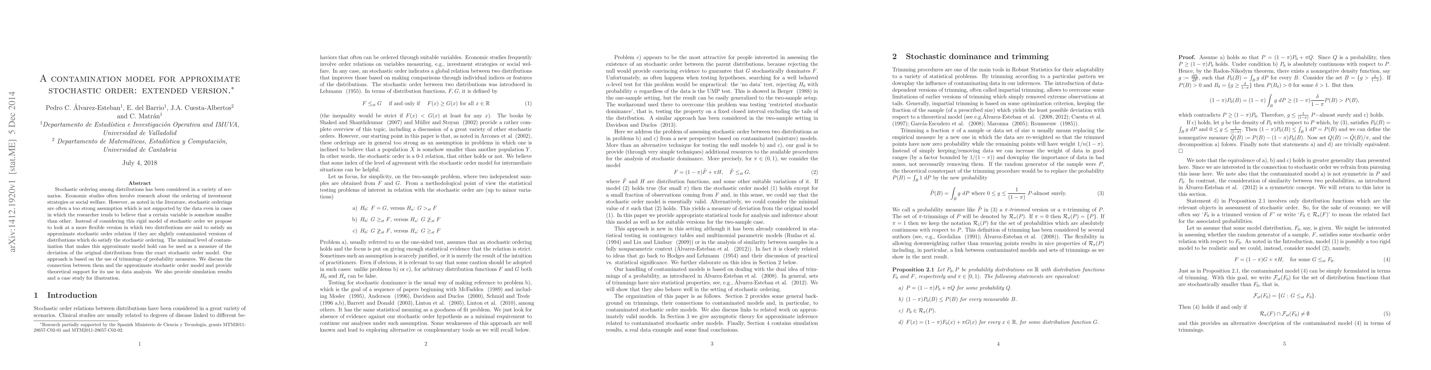 Stochastic ordering among distributions has been considered in a variety of scenarios. Economic studies often involve research about the ordering of investment strategies or social welfare. However, as noted in the literature, stochastic orderings are often a too strong assumption which is not supported by the data even in cases in which the researcher tends to believe that a certain variable is somehow smaller than other. Instead of considering this rigid model of stochastic order we propose to look at a more flexible version in which two distributions are said to satisfy an approximate stochastic order relation if they are slightly contaminated versions of distributions which do satisfy the stochastic ordering. The minimal level of contamination that makes this approximate model hold can be used as a measure of the deviation of the original distributions from the exact stochastic order model. Our approach is based on the use of trimmings of probability measures. We discuss the connection between them and the approximate stochastic order model and provide theoretical support for its use in data analysis. We also provide simulation results.