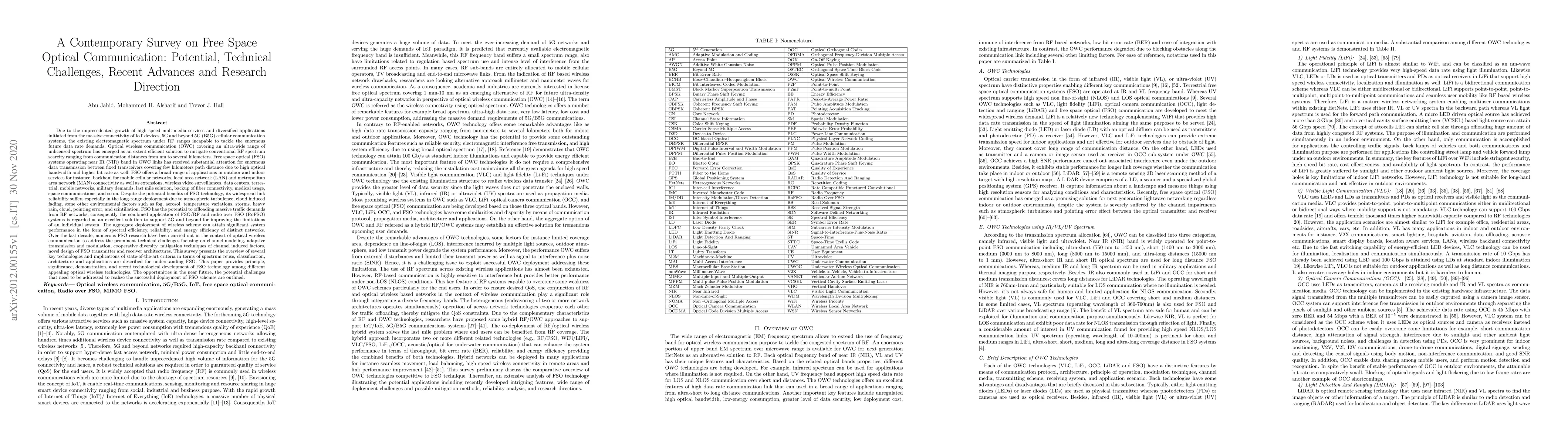 Free space optical communication has the potential to overcome RF spectrum scarcity, but its reliability is limited due to environmental factors. Researchers aim to improve FSO technology through advancements in spectrum reuse, architecture, and applications for 5G and beyond networks.
