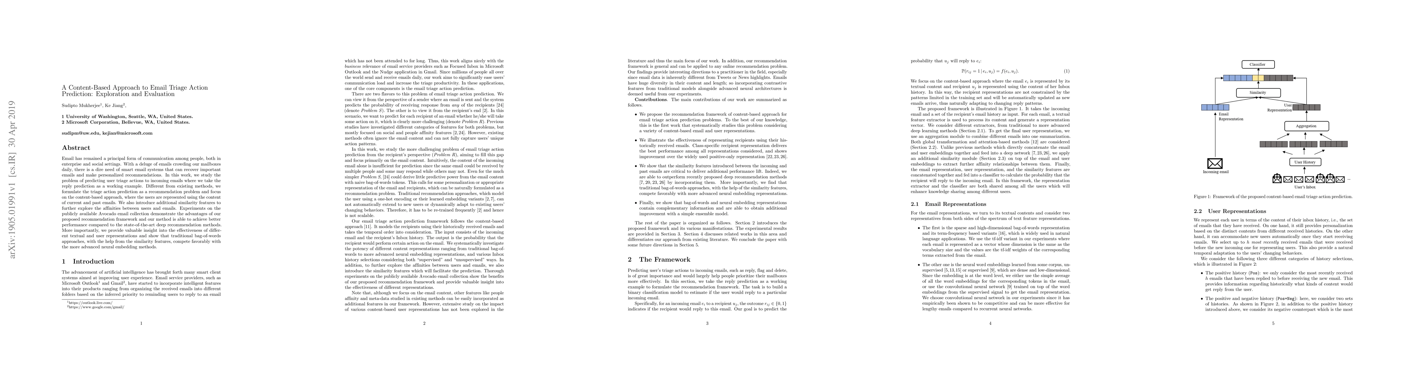 This paper explores a content-based approach for predicting user triage actions on emails, framing it as a recommendation problem. The proposed method, tested on the Avocado dataset, outperforms state-of-the-art deep recommendation methods, demonstrating that traditional bag-of-words models, enhanced with similarity features, can be effective alternatives to neural embedding techniques.