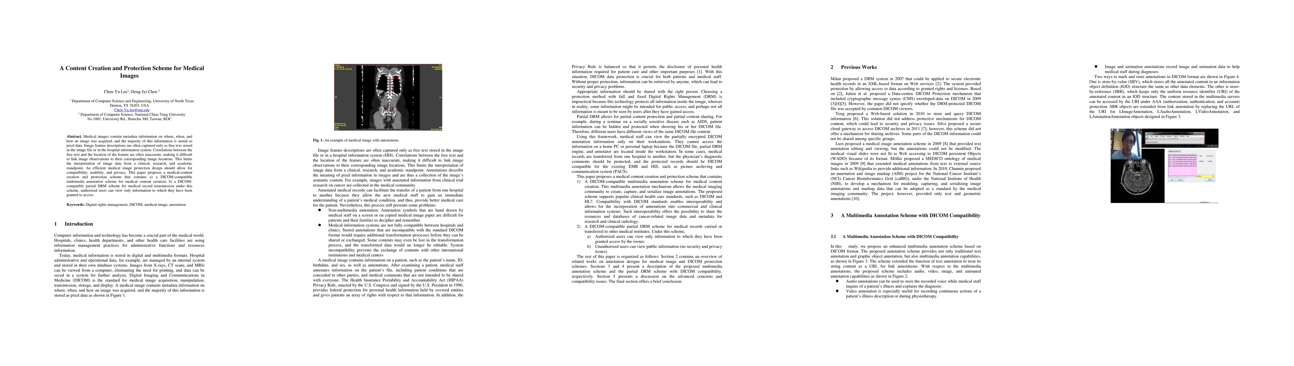 Medical images contain metadata information on where, when, and how an image was acquired, and the majority of this information is stored as pixel data. Image feature descriptions are often captured only as free text stored in the image file or in the hospital information system. Correlations between the free text and the location of the feature are often inaccurate, making it difficult to link image observations to their corresponding image locations. This limits the interpretation of image data from a clinical, research, and academic standpoint. An efficient medical image protection design should allow for compatibility, usability, and privacy. This paper proposes a medical-content creation and protection scheme that contains a) a DICOM-compatible multimedia annotation scheme for medical content creation; b) a DICOM-compatible partial DRM scheme for medical record transmission under this scheme, authorized users can view only information to which they have been granted to access.