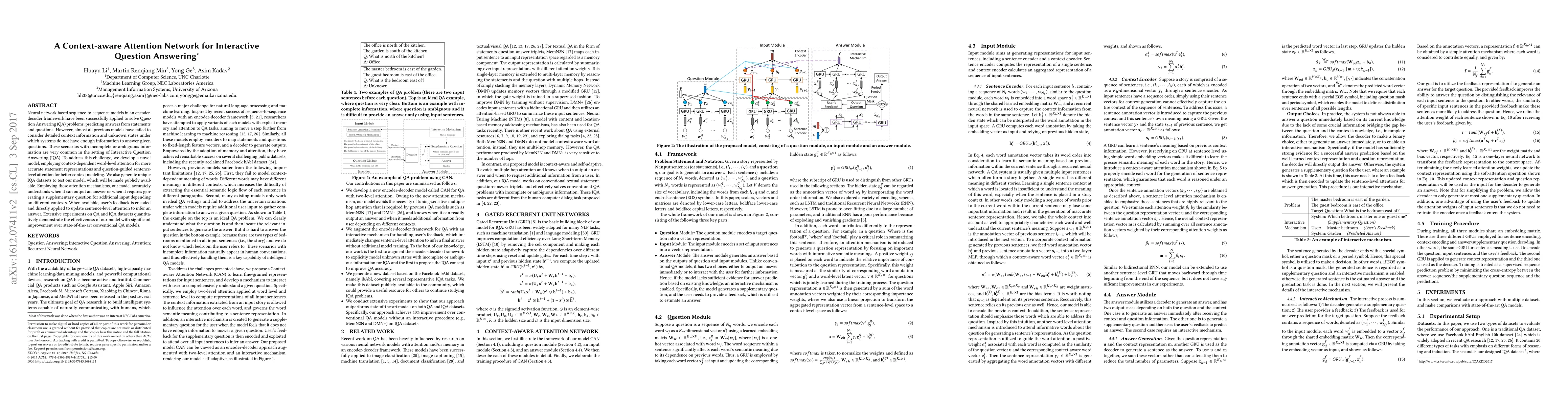 This paper introduces a context-aware attention network for Interactive Question Answering, utilizing context-dependent attention mechanisms to improve model accuracy and handle incomplete information. The model effectively determines when to answer or request additional input, showing significant improvements over existing QA models in experiments.