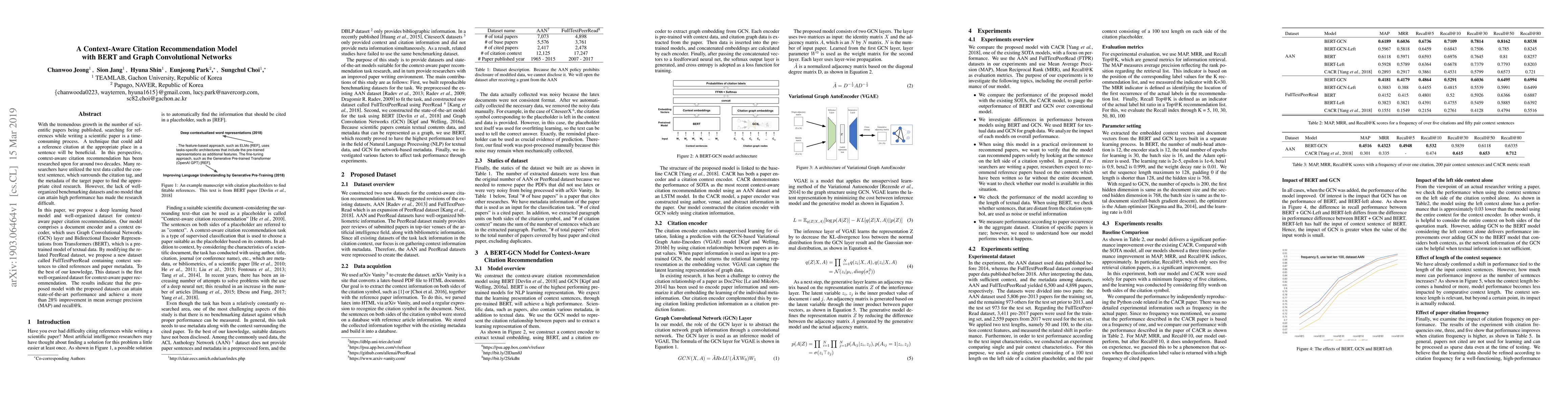 This paper proposes a context-aware citation recommendation model using BERT and Graph Convolutional Networks, along with a new dataset called FullTextPeerRead. The model achieves state-of-the-art performance, showing a 28% improvement in mean average precision and recall over existing methods.