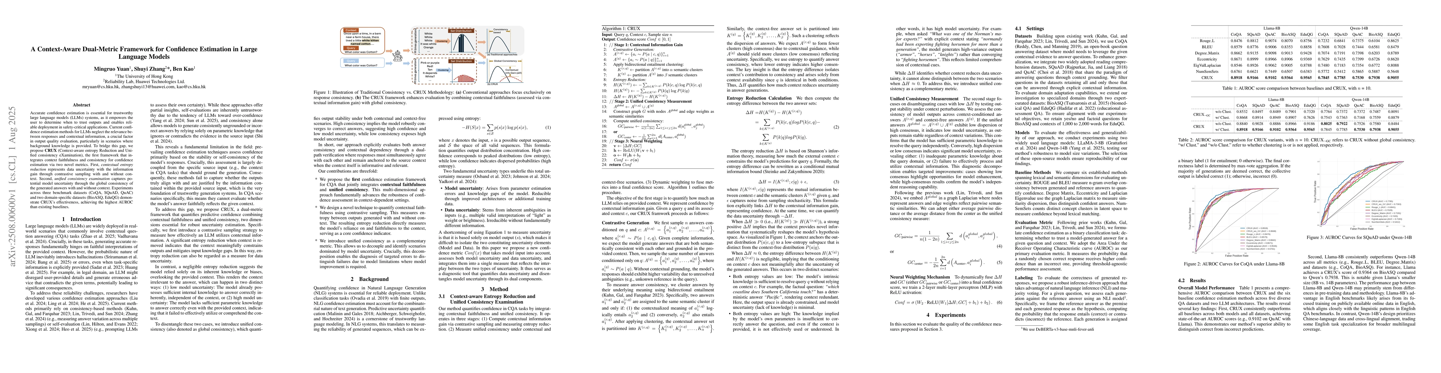 Accurate confidence estimation is essential for trustworthy large language models (LLMs) systems, as it empowers the user to determine when to trust outputs and enables reliable deployment in safety-critical applications. Current confidence estimation methods for LLMs neglect the relevance between responses and contextual information, a crucial factor in output quality evaluation, particularly in scenarios where background knowledge is provided. To bridge this gap, we propose CRUX (Context-aware entropy Reduction and Unified consistency eXamination), the first framework that integrates context faithfulness and consistency for confidence estimation via two novel metrics. First, contextual entropy reduction represents data uncertainty with the information gain through contrastive sampling with and without context. Second, unified consistency examination captures potential model uncertainty through the global consistency of the generated answers with and without context. Experiments across three benchmark datasets (CoQA, SQuAD, QuAC) and two domain-specific datasets (BioASQ, EduQG) demonstrate CRUX's effectiveness, achieving the highest AUROC than existing baselines.