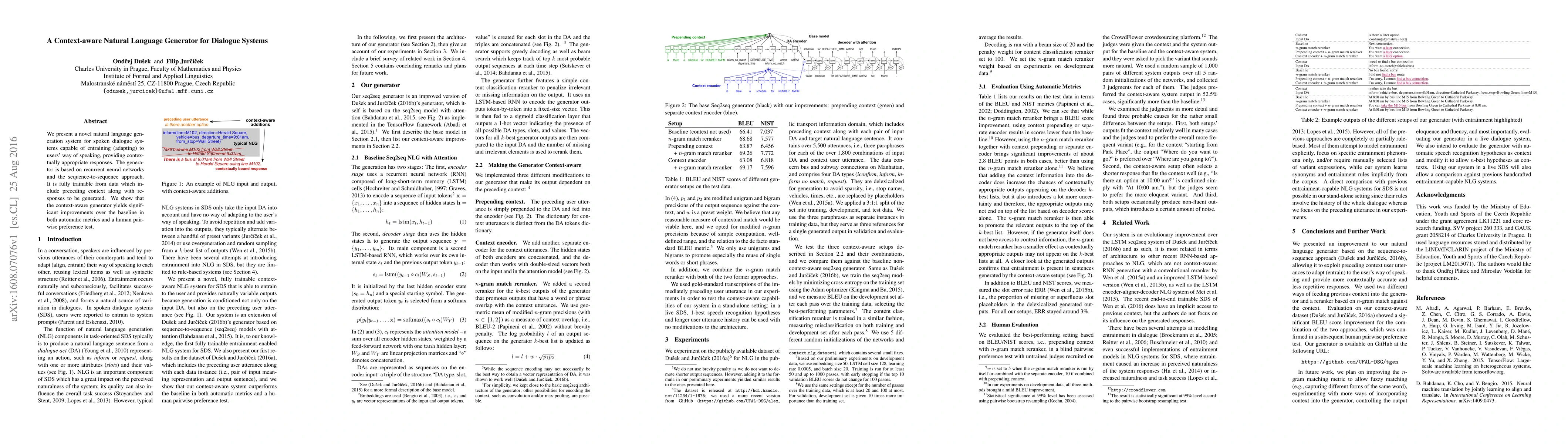 This paper introduces a context-aware natural language generator for dialogue systems that adapts to users' speech patterns, leveraging recurrent neural networks and sequence-to-sequence modeling. The system demonstrates superior performance over baselines in both automatic metrics and human preference tests.