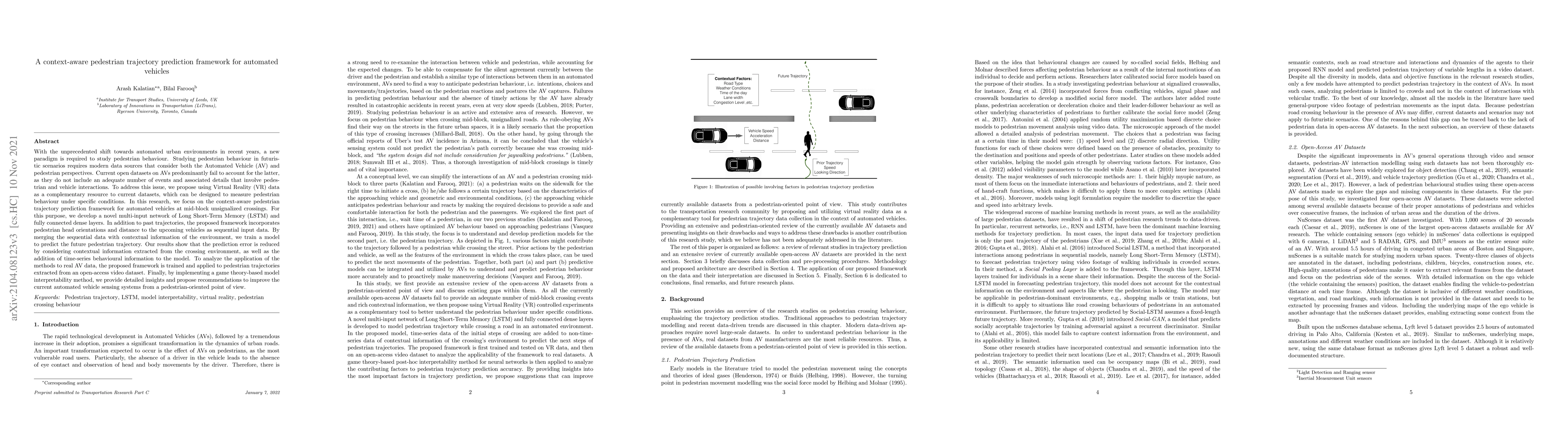 With the unprecedented shift towards automated urban environments in recent years, a new paradigm is required to study pedestrian behaviour. Studying pedestrian behaviour in futuristic scenarios requires modern data sources that consider both the Automated Vehicle (AV) and pedestrian perspectives. Current open datasets on AVs predominantly fail to account for the latter, as they do not include an adequate number of events and associated details that involve pedestrian and vehicle interactions. To address this issue, we propose using Virtual Reality (VR) data as a complementary resource to current datasets, which can be designed to measure pedestrian behaviour under specific conditions. In this research, we focus on the context-aware pedestrian trajectory prediction framework for automated vehicles at mid-block unsignalized crossings. For this purpose, we develop a novel multi-input network of Long Short-Term Memory (LSTM) and fully connected dense layers. In addition to past trajectories, the proposed framework incorporates pedestrian head orientations and distance to the upcoming vehicles as sequential input data. By merging the sequential data with contextual information of the environment, we train a model to predict the future pedestrian trajectory. Our results show that the prediction error and overfitting to the training data are reduced by considering contextual information in the model. To analyze the application of the methods to real AV data, the proposed framework is trained and applied to pedestrian trajectory extracted from an open-access video dataset. Finally, by implementing a game theory-based model interpretability method, we provide detailed insights and propose recommendations to improve the current automated vehicle sensing systems from a pedestrian-oriented point of view.