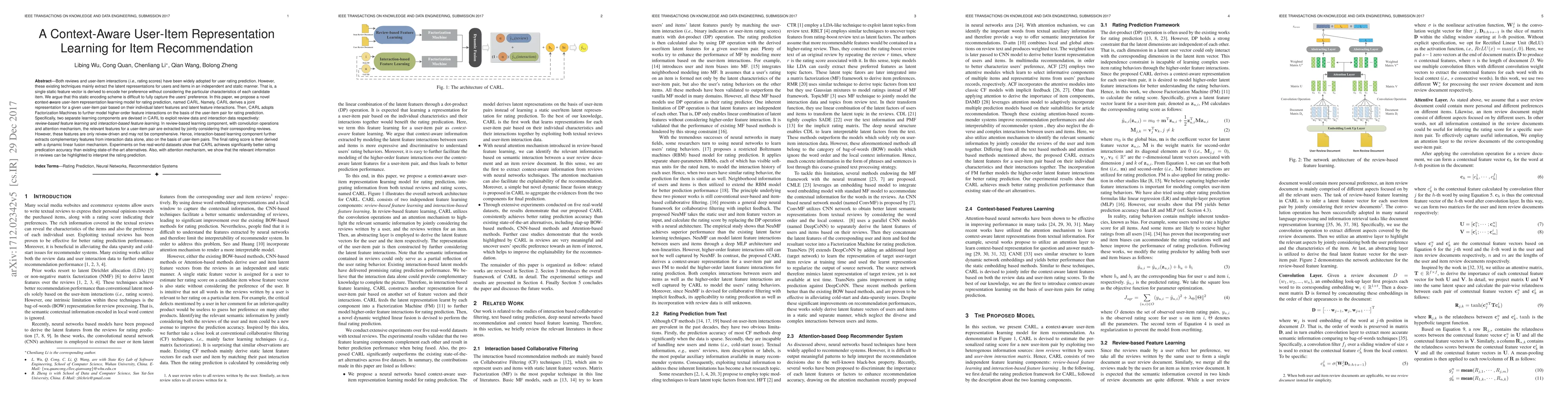 This paper proposes CARL, a context-aware user-item representation learning model for rating prediction that leverages both review and interaction data. CARL dynamically derives joint representations for user-item pairs, incorporating higher-order feature interactions, and achieves superior prediction accuracy over existing methods.