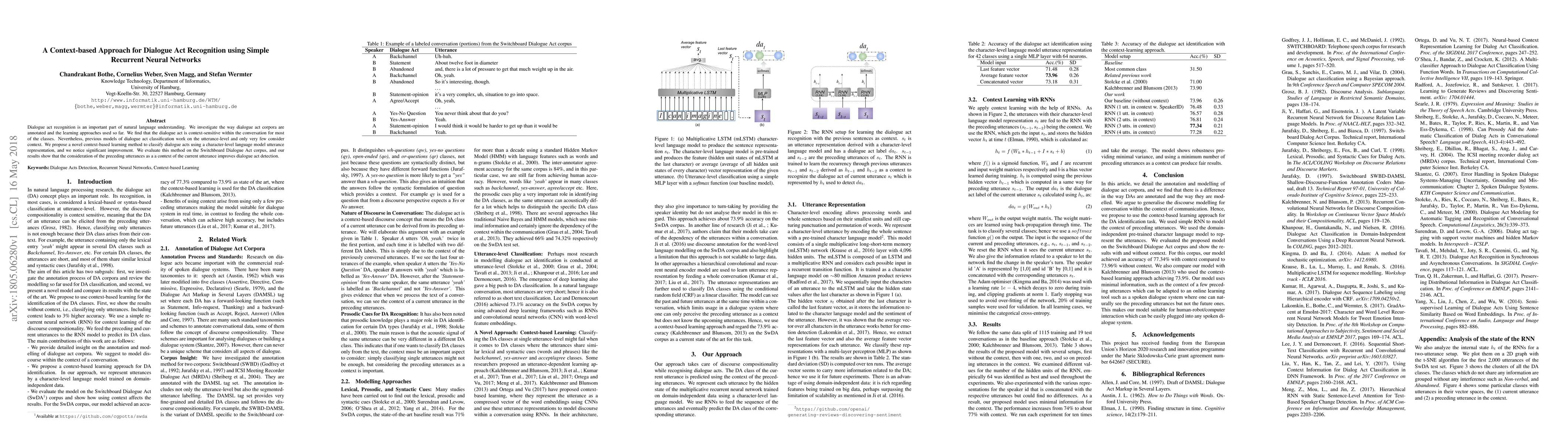 This paper proposes a context-based approach for dialogue act recognition using simple recurrent neural networks, showing that considering preceding utterances as context improves classification accuracy. The method employs a character-level language model to represent utterances, achieving better results on the Switchboard Dialogue Act corpus compared to utterance-level models.