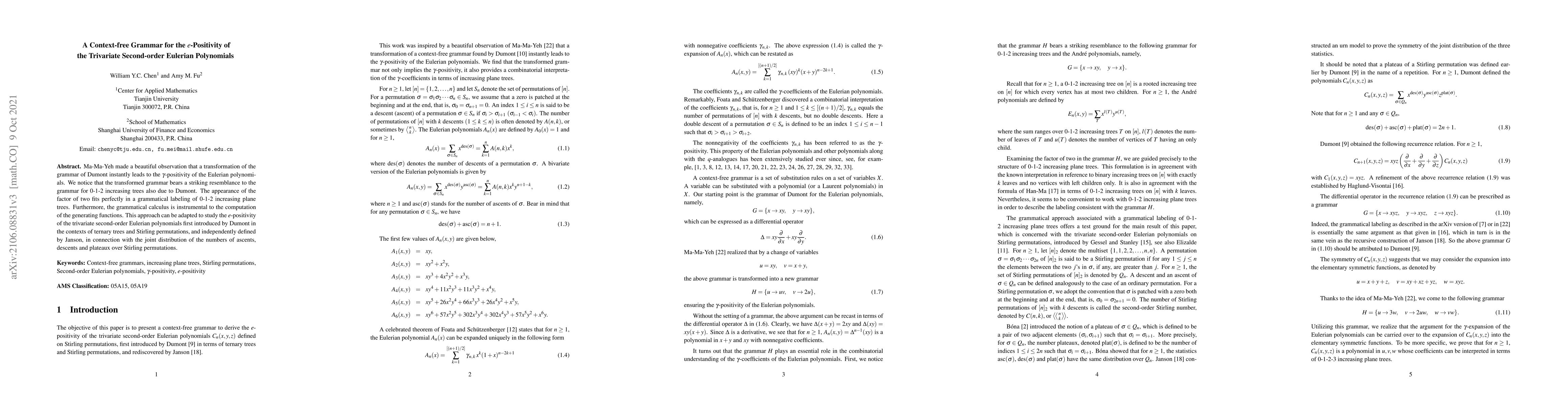 Ma-Ma-Yeh made a beautiful observation that a transformation of the grammar of Dumont instantly leads to the $\gamma$-positivity of the Eulerian polynomials. We notice that the transformed grammar bears a striking resemblance to the grammar for 0-1-2 increasing trees also due to Dumont. The appearance of the factor of two fits perfectly in a grammatical labeling of 0-1-2 increasing plane trees. Furthermore, the grammatical calculus is instrumental to the computation of the generating functions. This approach can be adapted to study the $e$-positivity of the trivariate second-order Eulerian polynomials first introduced by Dumont in the contexts of ternary trees and Stirling permutations, and independently defined by Janson, in connection with the joint distribution of the numbers of ascents, descents and plateaux over Stirling permutations.