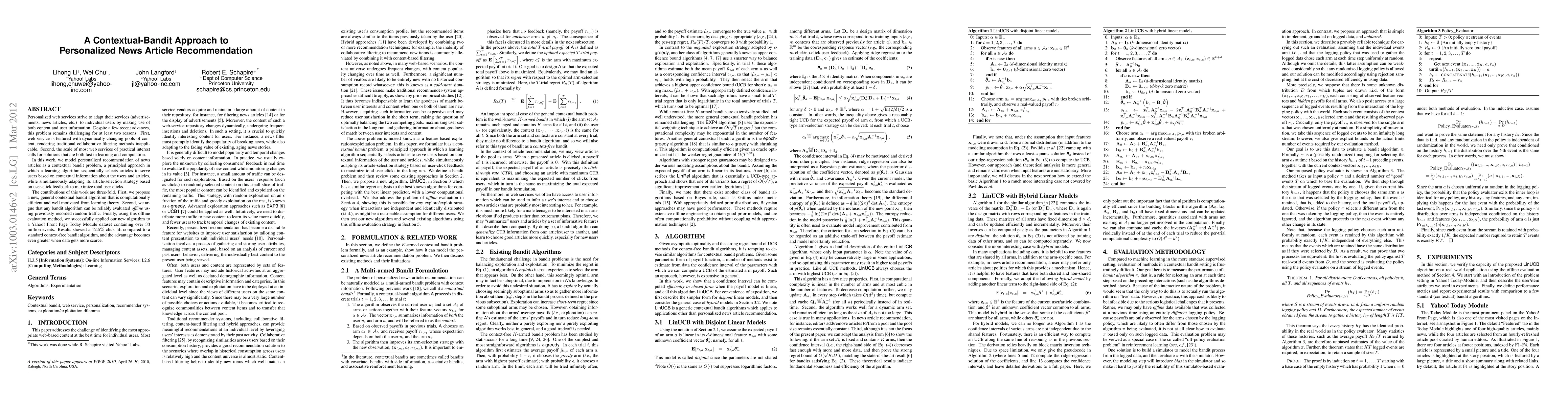 This paper proposes a contextual-bandit approach for personalized news article recommendation, addressing the challenges of dynamic content and scalability. The authors introduce a new efficient contextual bandit algorithm and demonstrate its effectiveness using a Yahoo! dataset, achieving a 12.5% improvement in user clicks compared to a standard context-free algorithm.