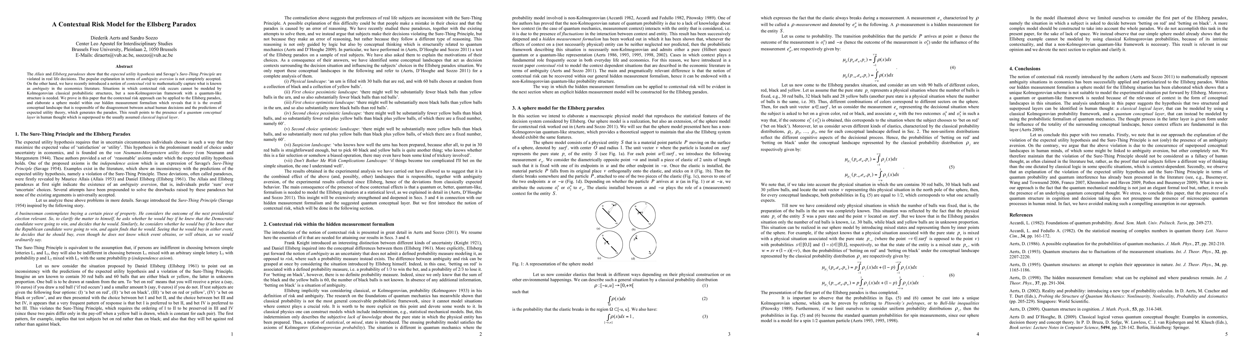 The Allais and Ellsberg paradoxes show that the expected utility hypothesis and Savage's Sure-Thing Principle are violated in real life decisions. The popular explanation in terms of 'ambiguity aversion' is not completely accepted. On the other hand, we have recently introduced a notion of 'contextual risk' to mathematically capture what is known as 'ambiguity' in the economics literature. Situations in which contextual risk occurs cannot be modeled by Kolmogorovian classical probabilistic structures, but a non-Kolmogorovian framework with a quantum-like structure is needed. We prove in this paper that the contextual risk approach can be applied to the Ellsberg paradox, and elaborate a 'sphere model' within our 'hidden measurement formalism' which reveals that it is the overall conceptual landscape that is responsible of the disagreement between actual human decisions and the predictions of expected utility theory, which generates the paradox. This result points to the presence of a 'quantum conceptual layer' in human thought which is superposed to the usually assumed 'classical logical layer'.