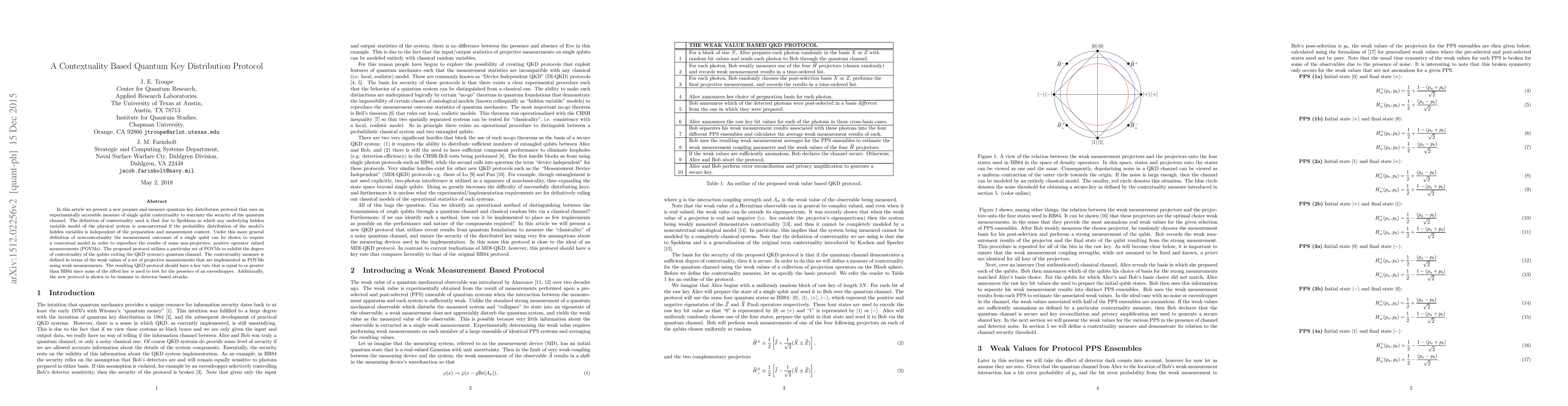 This paper introduces a novel quantum key distribution protocol that leverages contextuality measures based on single qubit weak values to ensure secure communication. The protocol uses non-projective positive operator valued measurements (POVMs) to detect contextuality, providing security against detector-based attacks and maintaining or surpassing the key rate of BB84.