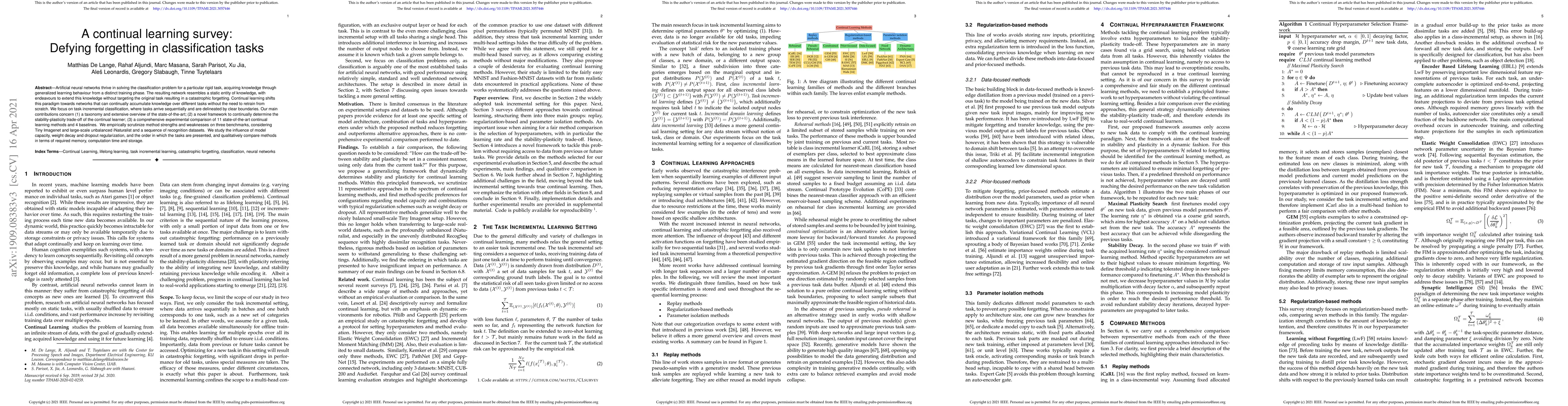 Artificial neural networks thrive in solving the classification problem for a particular rigid task, acquiring knowledge through generalized learning behaviour from a distinct training phase. The resulting network resembles a static entity of knowledge, with endeavours to extend this knowledge without targeting the original task resulting in a catastrophic forgetting. Continual learning shifts this paradigm towards networks that can continually accumulate knowledge over different tasks without the need to retrain from scratch. We focus on task incremental classification, where tasks arrive sequentially and are delineated by clear boundaries. Our main contributions concern 1) a taxonomy and extensive overview of the state-of-the-art, 2) a novel framework to continually determine the stability-plasticity trade-off of the continual learner, 3) a comprehensive experimental comparison of 11 state-of-the-art continual learning methods and 4 baselines. We empirically scrutinize method strengths and weaknesses on three benchmarks, considering Tiny Imagenet and large-scale unbalanced iNaturalist and a sequence of recognition datasets. We study the influence of model capacity, weight decay and dropout regularization, and the order in which the tasks are presented, and qualitatively compare methods in terms of required memory, computation time, and storage.