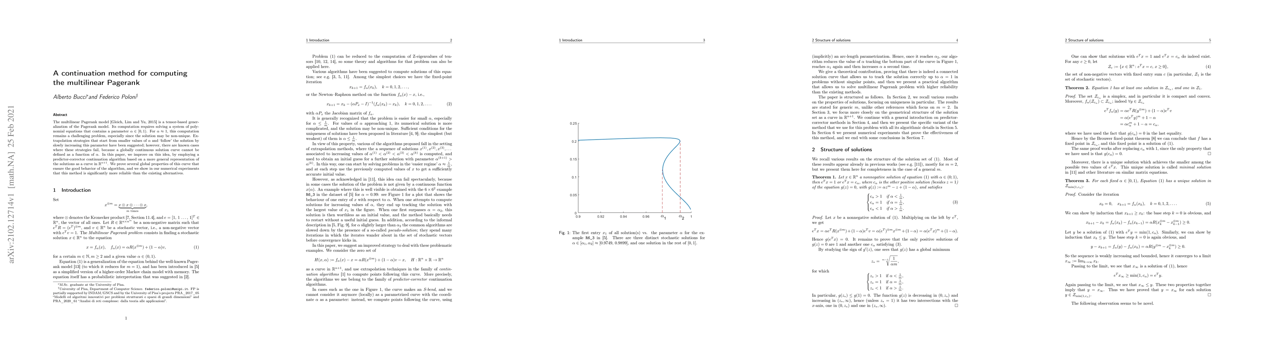 This paper proposes a predictor-corrector continuation algorithm to improve the computation of the multilinear Pagerank model, addressing the challenge of non-unique solutions for $\alpha \approx 1$. The new method, based on a more general representation, proves global properties ensuring reliable performance and outperforms existing extrapolation strategies.