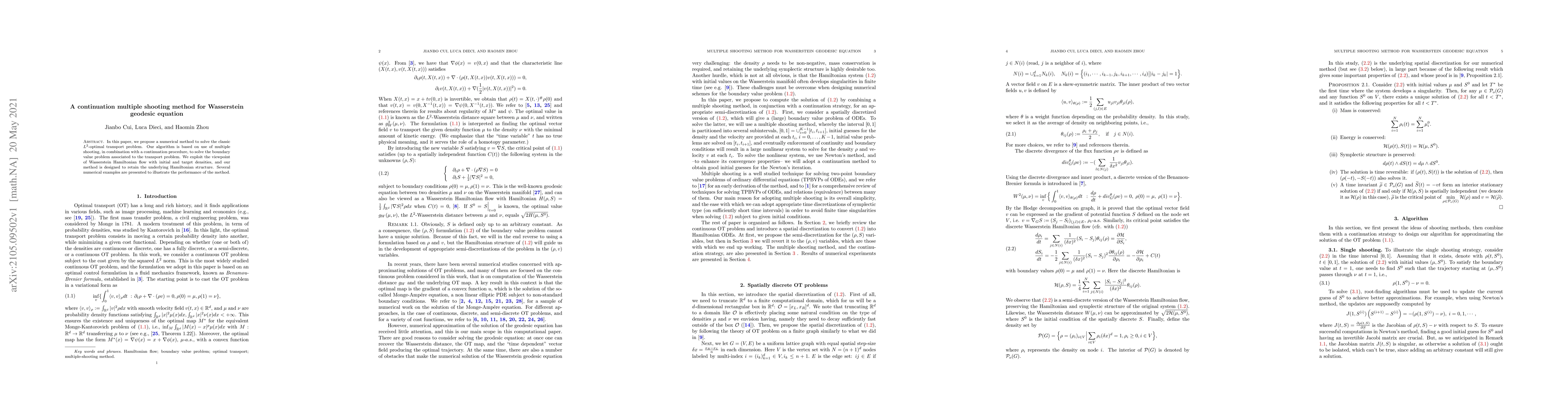 In this paper, we propose a numerical method to solve the classic $L^2$-optimal transport problem. Our algorithm is based on use of multiple shooting, in combination with a continuation procedure, to solve the boundary value problem associated to the transport problem. We exploit the viewpoint of Wasserstein Hamiltonian flow with initial and target densities, and our method is designed to retain the underlying Hamiltonian structure. Several numerical examples are presented to illustrate the performance of the method.
