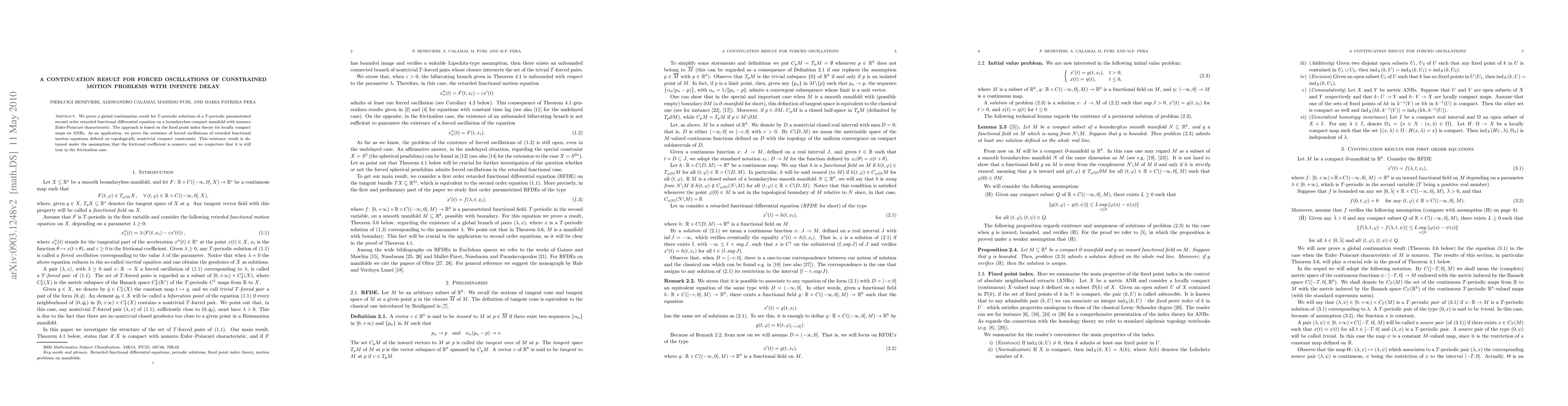 We prove a global continuation result for $T$-periodic solutions of a $T$-periodic parametrized second order retarded functional differential equation on a boundaryless compact manifold with nonzero Euler-Poincare' characteristic. The approach is based on the fixed point index theory for locally compact maps on ANRs. As an application, we prove the existence of forced oscillations of retarded functional motion equations defined on topologically nontrivial compact constraints. This existence result is obtained under the assumption that the frictional coefficient is nonzero, and we conjecture that it is still true in the frictionless case.