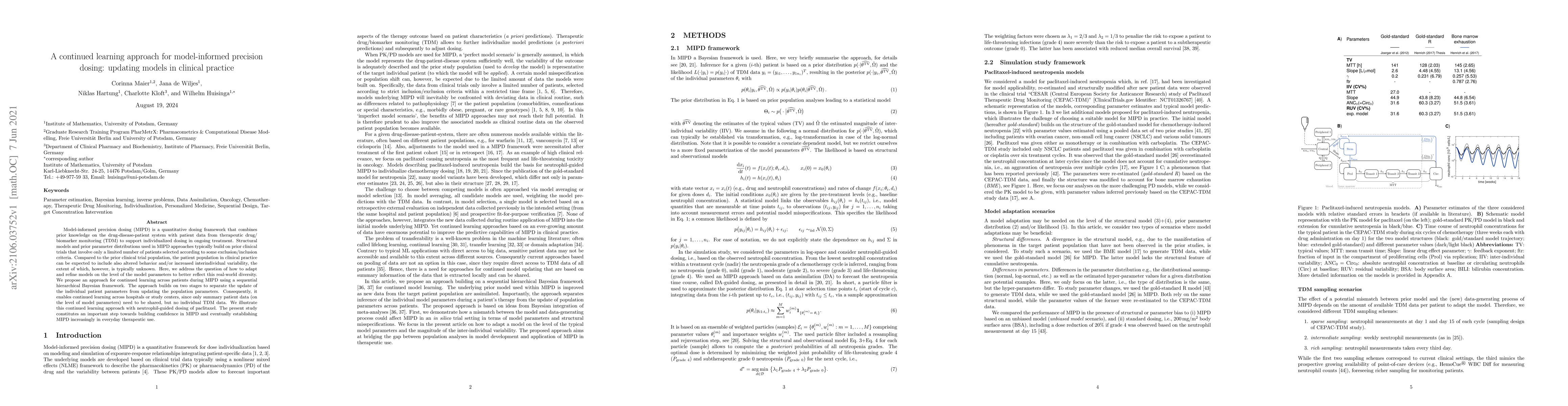 Model-informed precision dosing (MIPD) is a quantitative dosing framework that combines prior knowledge on the drug-disease-patient system with patient data from therapeutic drug/ biomarker monitoring (TDM) to support individualized dosing in ongoing treatment.Structural models and prior parameter distributions used in MIPD approaches typically build on prior clinical trials that involve only a limited number of patients selected according to some exclusion/inclusion criteria. Compared to the prior clinical trial population, the patient population in clinical practice can be expected to include also altered behavior and/or increased interindividual variability, the extent of which, however, is typically unknown. Here, we address the question of how to adapt and refine models on the level of the model parameters to better reflect this real-world diversity. We propose an approach for continued learning across patients during MIPD using a sequential hierarchical Bayesian framework. The approach builds on two stages to separate the update of the individual patient parameters from updating the population parameters. Consequently, it enables continued learning across hospitals or study centers, since only summary patient data (on the level of model parameters) need to be shared, but no individual TDM data. We illustrate this continued learning approach with neutrophil-guided dosing of paclitaxel. The present study constitutes an important step towards building confidence in MIPD and eventually establishing MIPD increasingly in everyday therapeutic use.