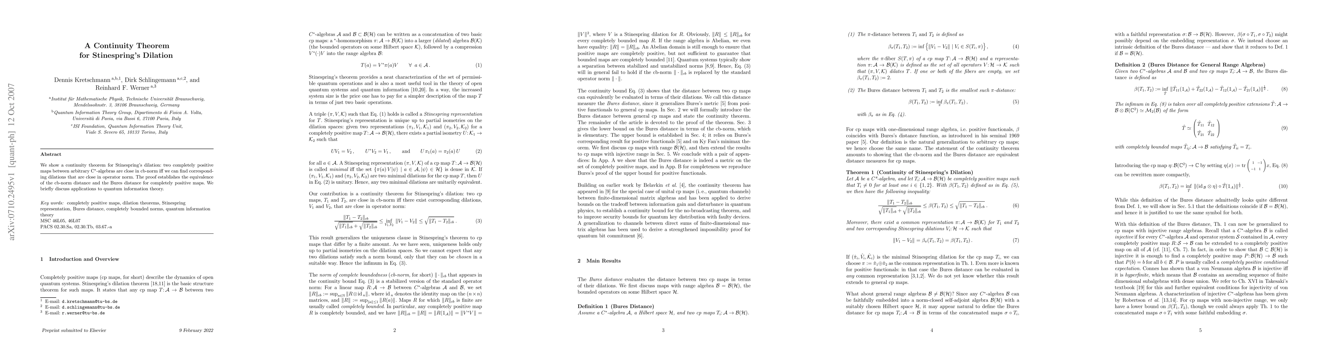 This paper proves a continuity theorem for Stinespring's dilation, showing that two completely positive maps between C*-algebras are close in cb-norm if and only if their corresponding dilations are close in operator norm. The proof also establishes the equivalence of the cb-norm and Bures distance for these maps, with brief implications for quantum information theory.